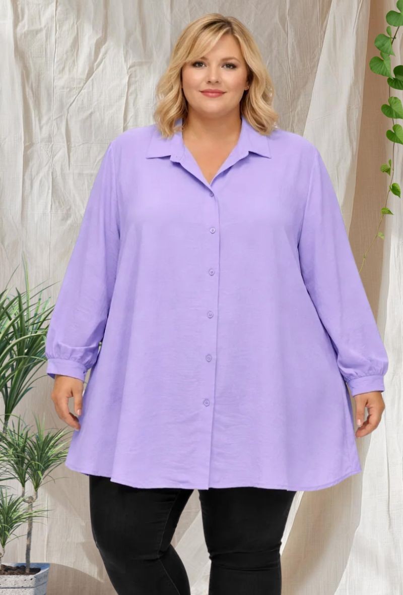 Camisa larga, vaporosa y extragrande, confeccionada en crepé de viscosa suave y ligeramente elástico. Corte evasé con abertura en la espalda, muy cómoda y favorecedora para tallas grandes.
