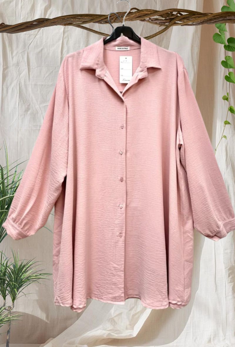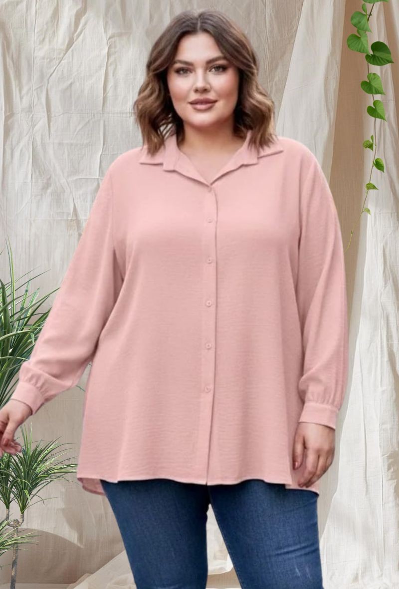 Camisa larga, vaporosa y extragrande, confeccionada en crepé de viscosa suave y ligeramente elástico. Corte evasé con abertura en la espalda, muy cómoda y favorecedora para tallas grandes.