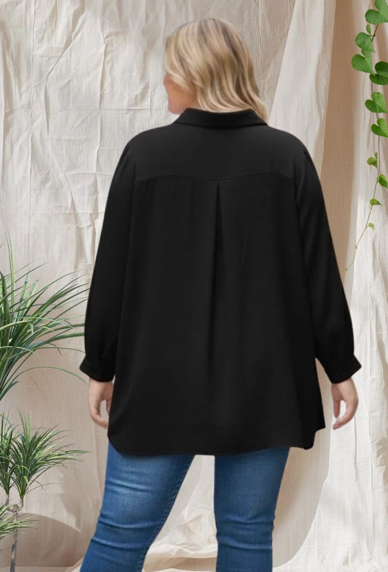 Camisa larga, vaporosa y extragrande, confeccionada en crepé de viscosa suave y ligeramente elástico. Corte evasé con abertura en la espalda, muy cómoda y favorecedora para tallas grandes.