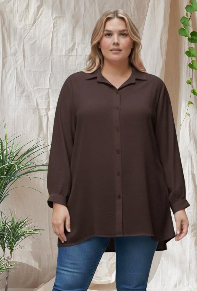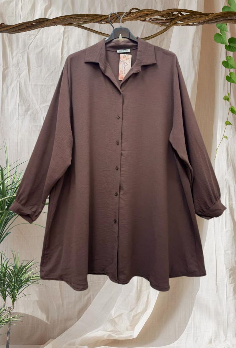 Camisa larga, vaporosa y extragrande, confeccionada en crepé de viscosa suave y ligeramente elástico. Corte evasé con abertura en la espalda, muy cómoda y favorecedora para tallas grandes.