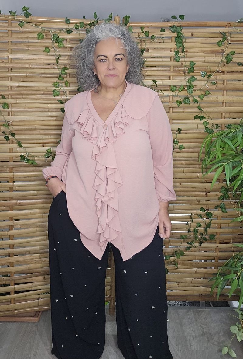 Camisa ligera y fluida de crepé de viscosa, con volantes decorativos en el escote y la tapeta de botones.