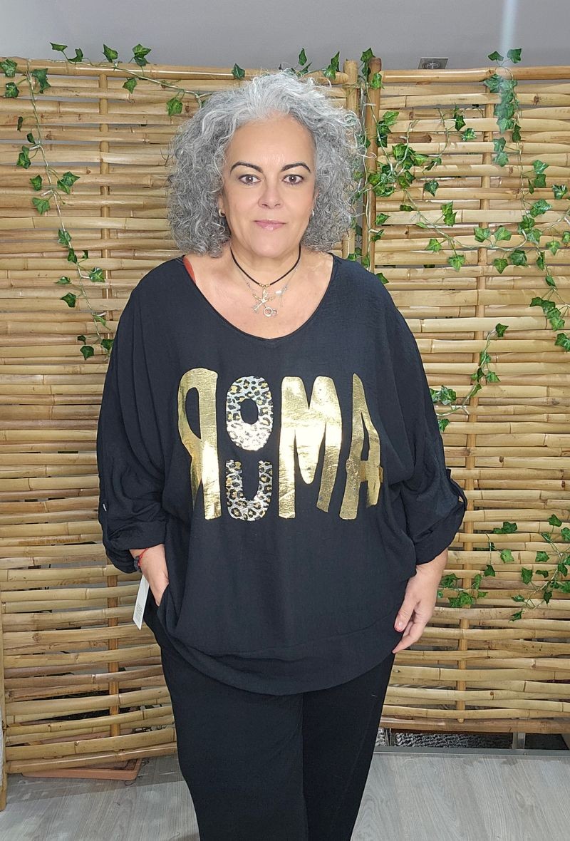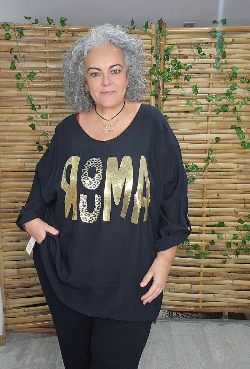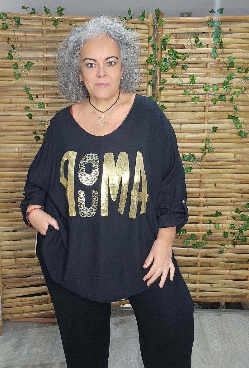 Blusa larga de tejido suave y fluido, con estampado delantero en letras doradas que aporta un toque moderno y llamativo. Diseño amplio y cómodo, ideal para el día a día. Disponible en diferentes colores.