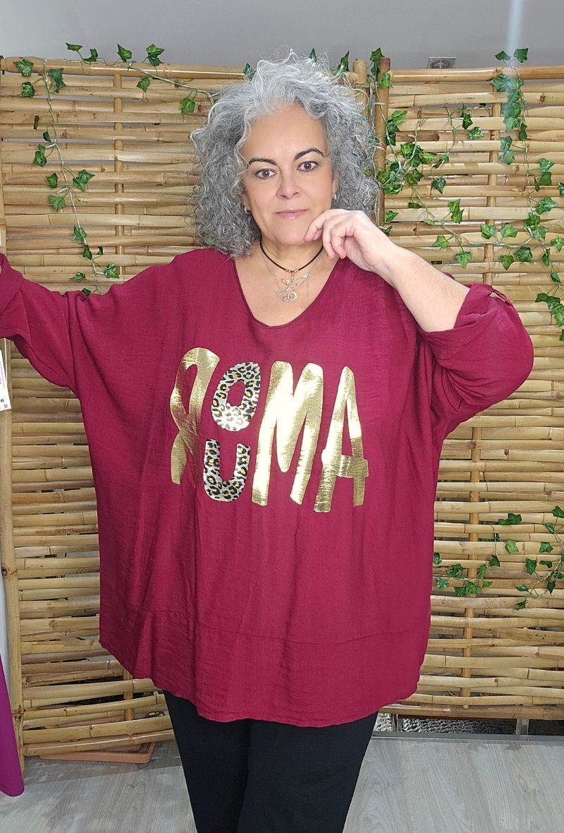 Blusa larga de tejido suave y fluido, con estampado delantero en letras doradas que aporta un toque moderno y llamativo. Diseño amplio y cómodo, ideal para el día a día. Disponible en diferentes colores.