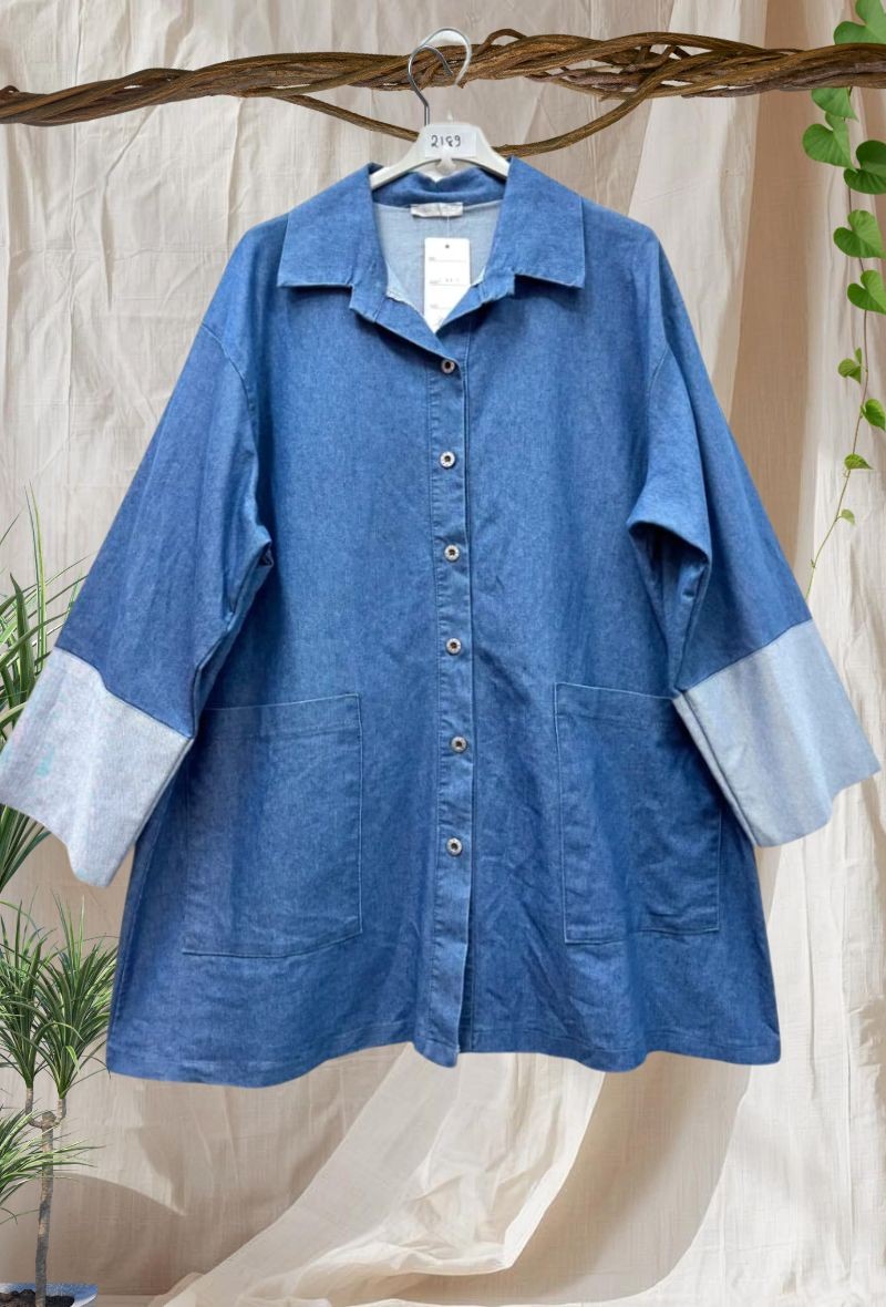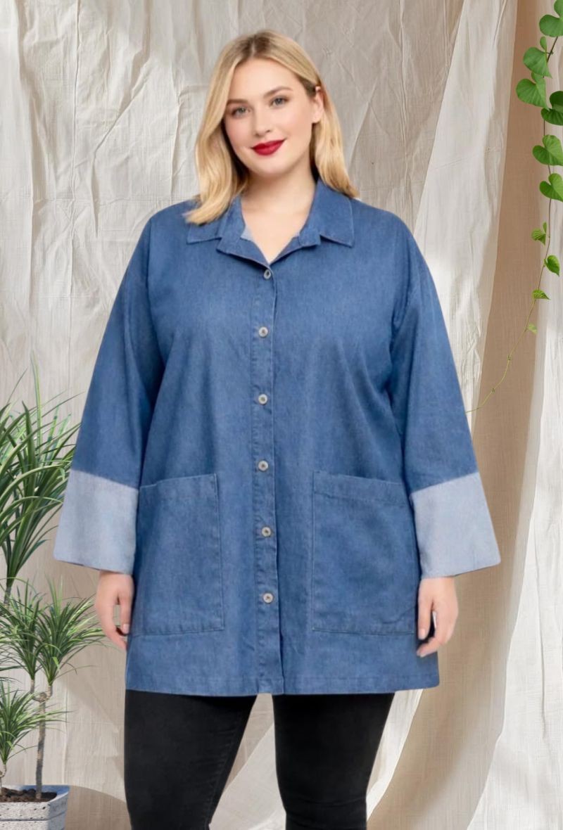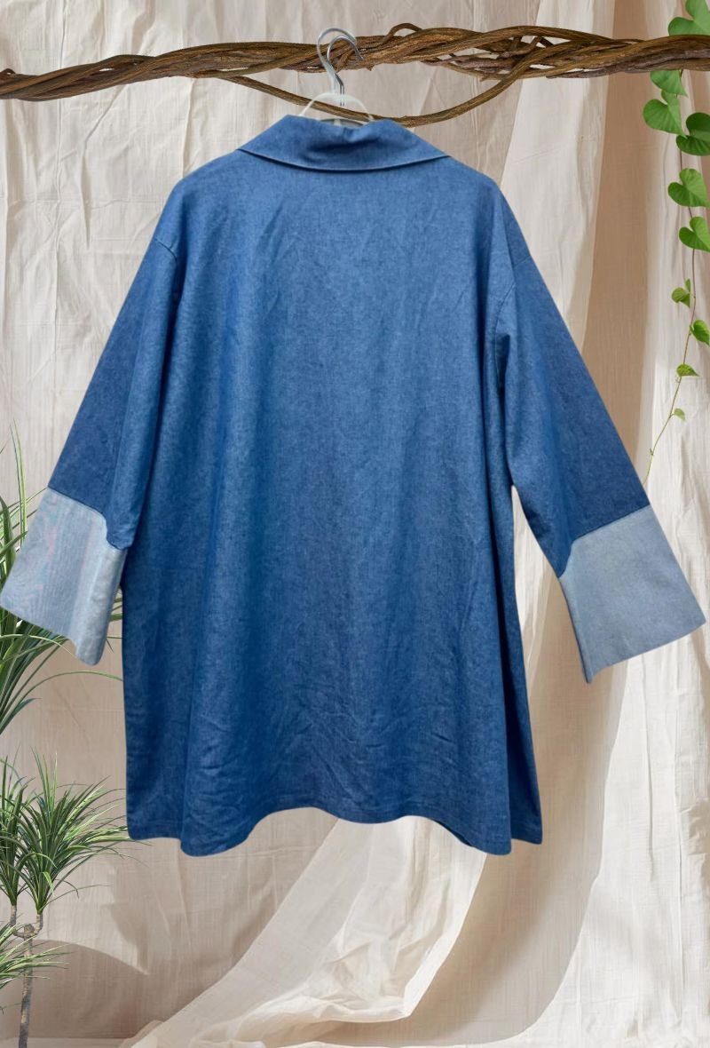 Sobrecamisa/chaqueta vaquera estilo worker, de corte recto y holgado con cierre de botones. Diseño con mangas largas y puños en contraste, tejido suave ideal para entretiempo. Incluye dos bolsillos de parche delanteros. Disponible en 2 tallas.