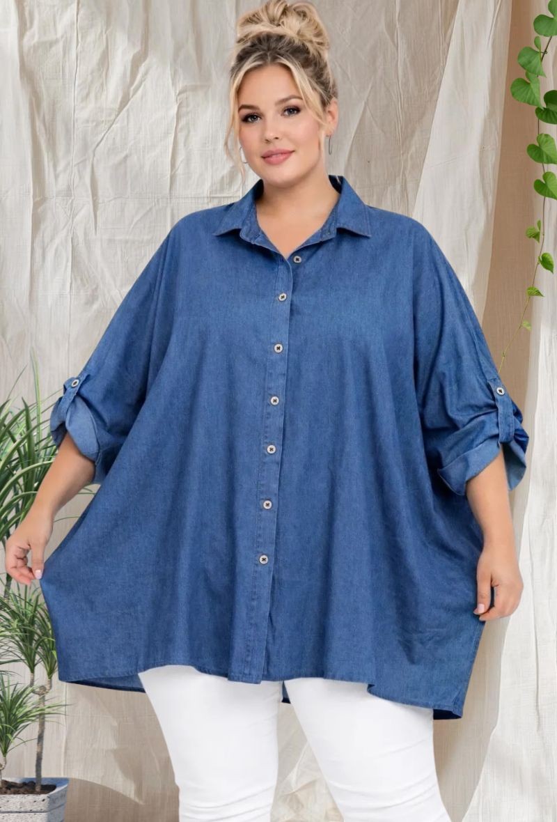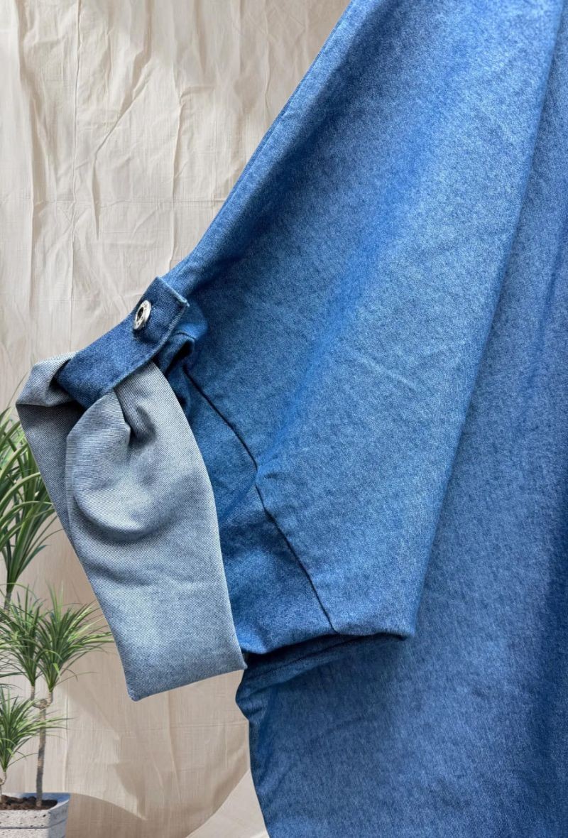 Camisa/sobrecamisa vaquera oversize, confeccionada en denim de alta calidad (Tencel) con buena estructura y toque elástico para mayor comodidad. Diseño de corte rectangular holgado, con mangas remangables y cierre frontal de botones. Ideal para llevar abierta o cerrada.