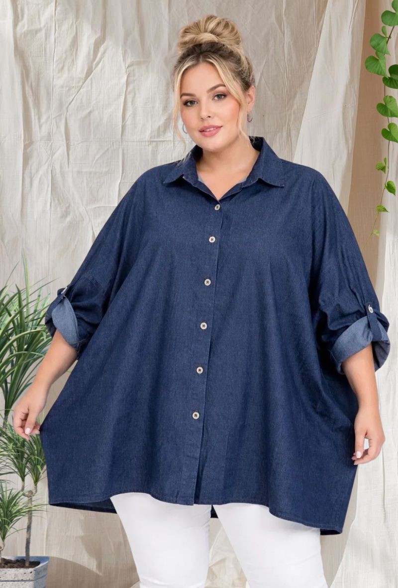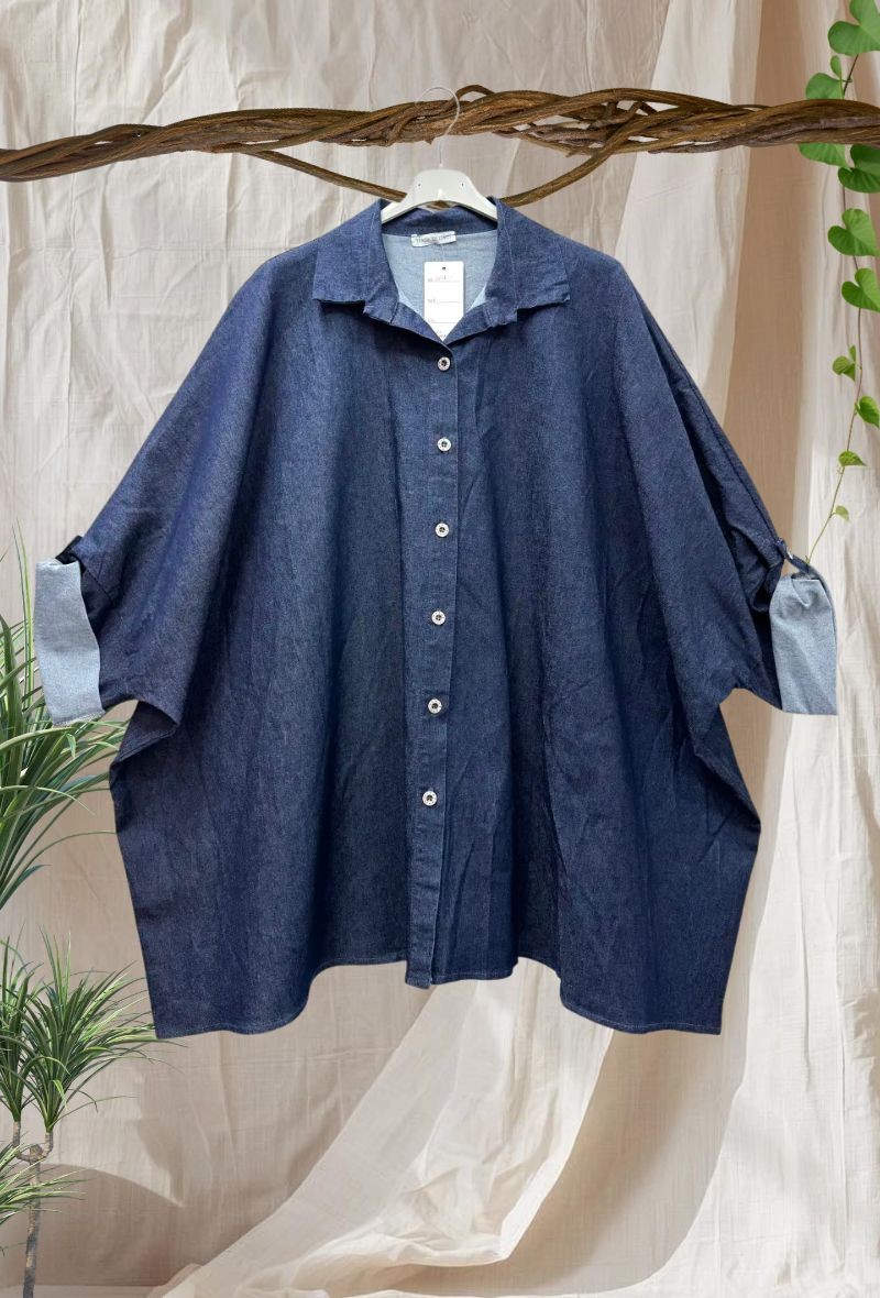 Camisa/sobrecamisa vaquera oversize, confeccionada en denim de alta calidad (Tencel) con buena estructura y toque elástico para mayor comodidad. Diseño de corte rectangular holgado, con mangas remangables y cierre frontal de botones. Ideal para llevar abierta o cerrada.