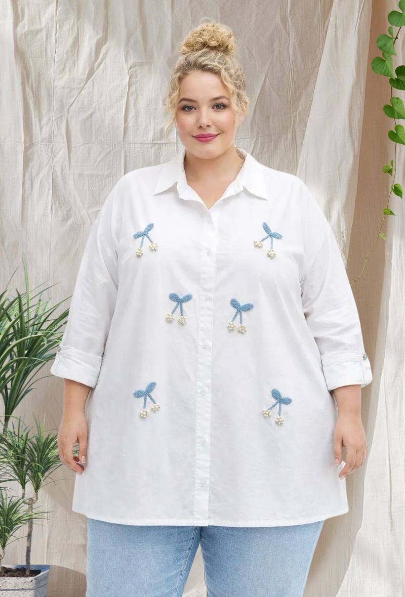 Camisa larga y ligera de popelina de algodón con delicados motivos de cerezas perladas que aportan un toque especial y femenino. Diseño de corte recto y relajado, con pliegue en la espalda que da mayor comodidad y movimiento.
