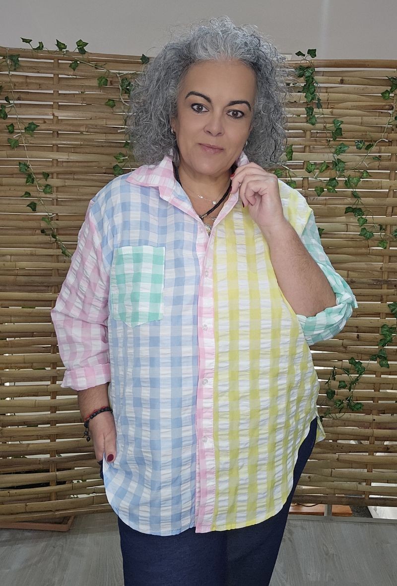 Camisa de poliéster ligero con estampado de cuadros en tonos combinados. Diseño original con contraste de colores y bolsillo delantero. Es ligeramente más corta por delante, lo que estiliza y aporta un toque moderno.