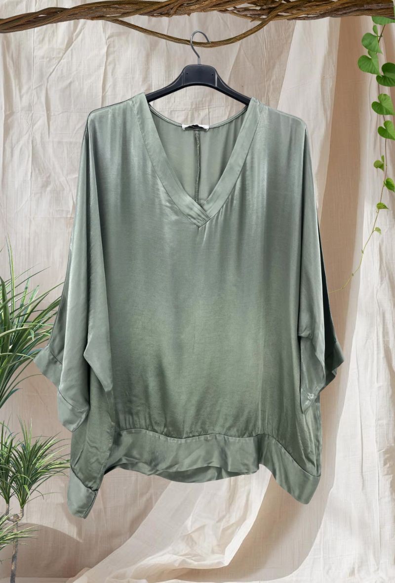 Blusa satinada de viscosa 100% con acabado brillante y caída elegante. Diseño amplio con escote en V favorecedor y manga corta amplia que aporta comodidad. Tejido fluido y ligero que estiliza y no marca.