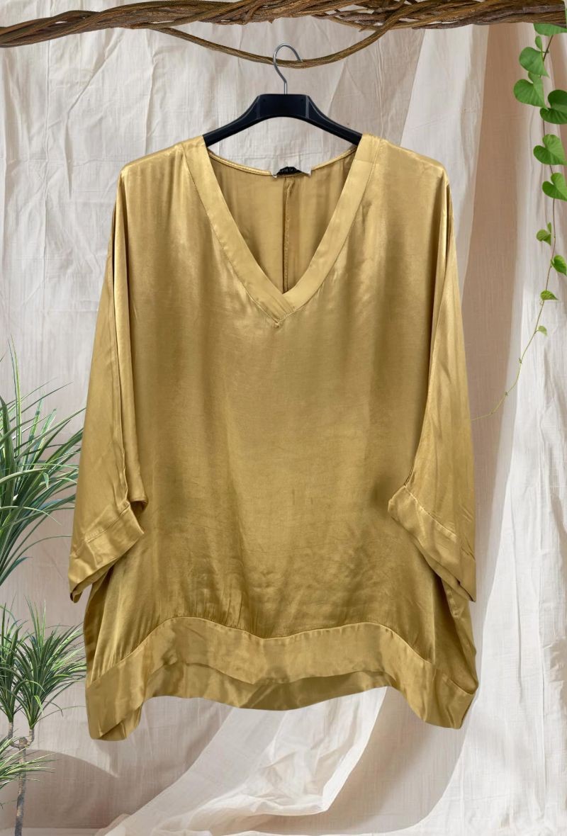 Blusa satinada de viscosa 100% con acabado brillante y caída elegante. Diseño amplio con escote en V favorecedor y manga corta amplia que aporta comodidad. Tejido fluido y ligero que estiliza y no marca.