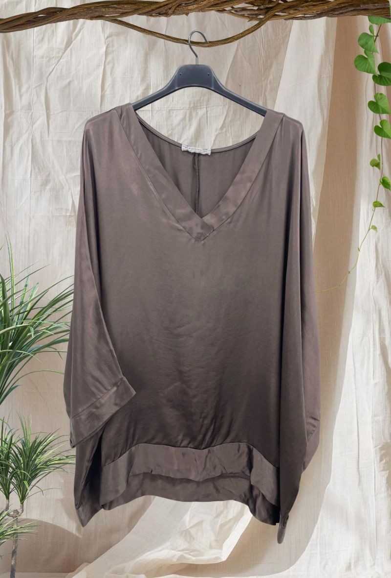 Blusa satinada de viscosa 100% con acabado brillante y caída elegante. Diseño amplio con escote en V favorecedor y manga corta amplia que aporta comodidad. Tejido fluido y ligero que estiliza y no marca.