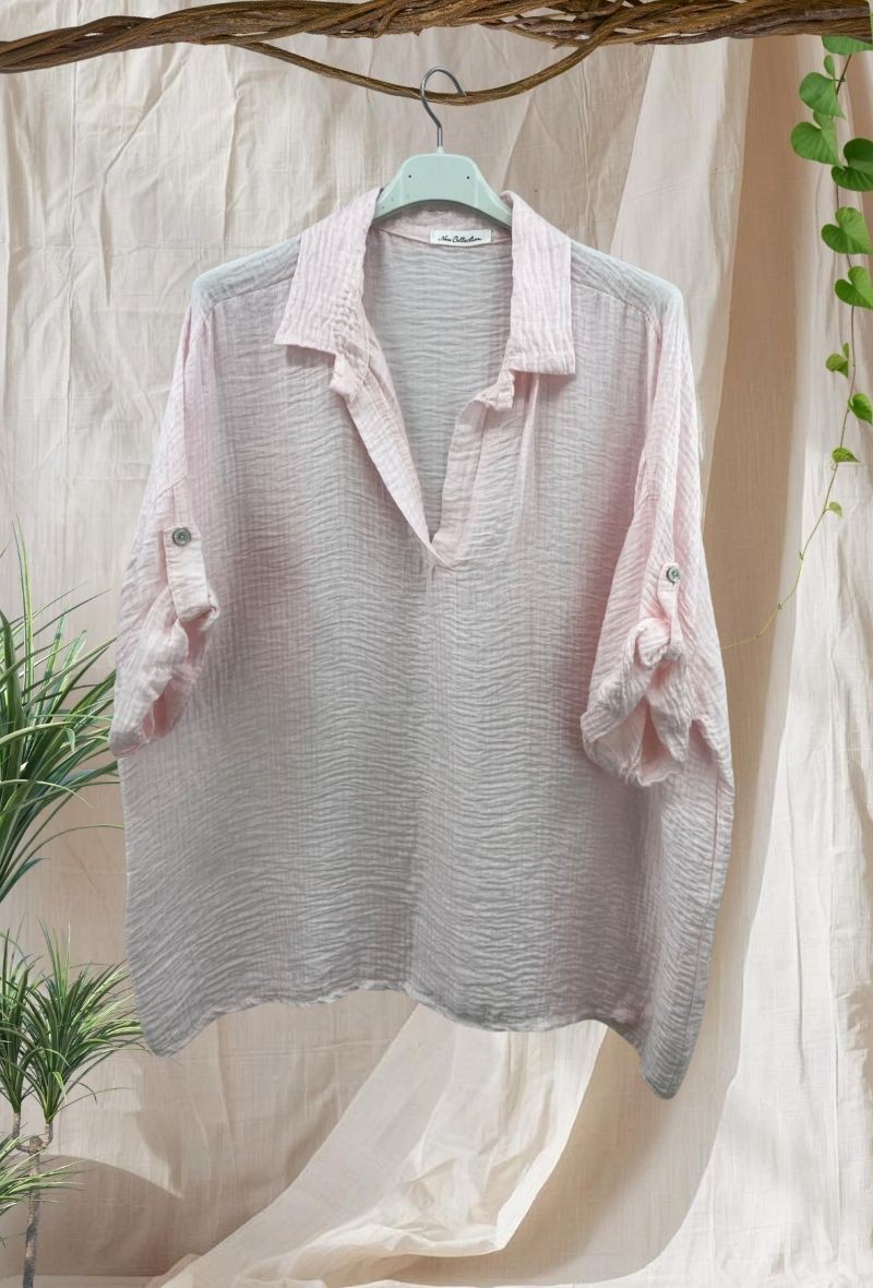 Blusa fluida con tejido de textura arrugada muy ligero y cómodo. Diseño amplio con escote camiseto y manga 3/4. Prenda versátil que puede llevarse sola o combinada con el pantalón a juego para crear un look completo.