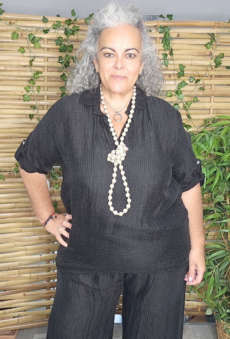 Blusa fluida con tejido de textura arrugada muy ligero y cómodo. Diseño amplio con escote camiseto y manga 3/4. Prenda versátil que puede llevarse sola o combinada con el pantalón a juego para crear un look completo.