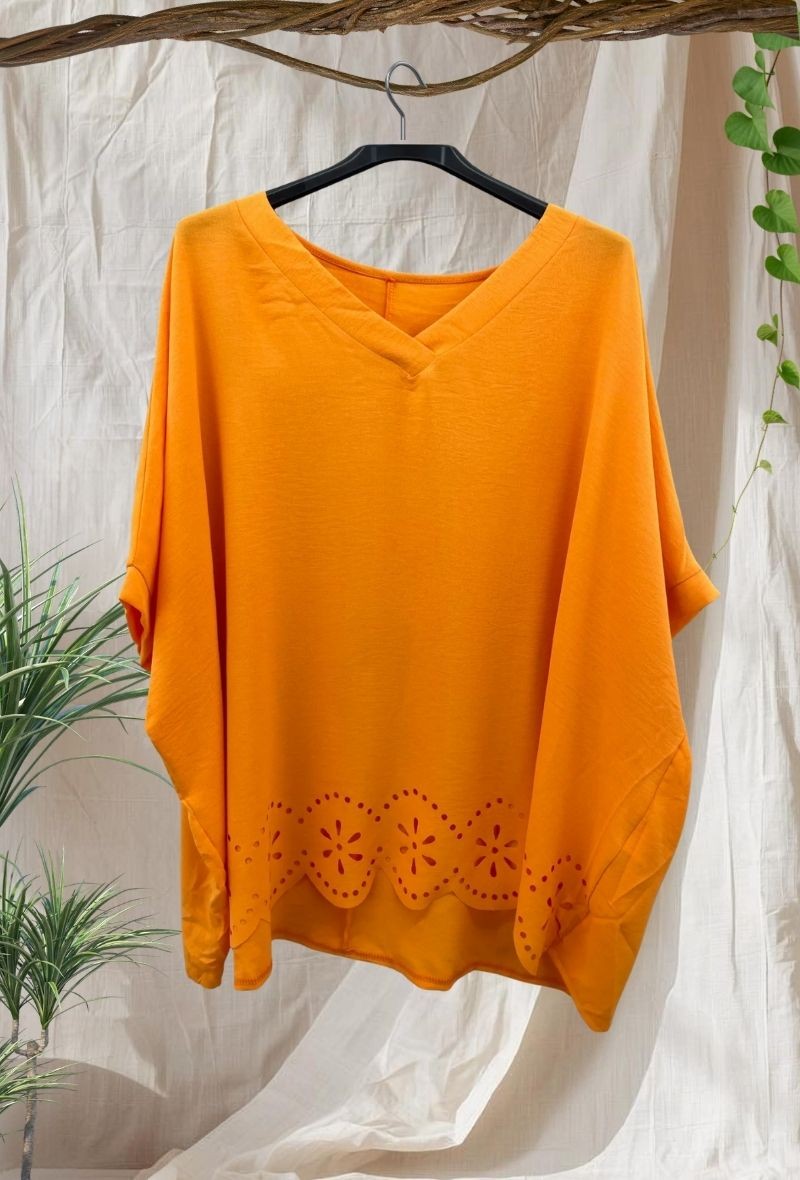 Blusa fluida con escote en pico y detalle calado en el bajo que aporta un toque femenino y diferente. Ligera, cómoda y con caída que no marca.
