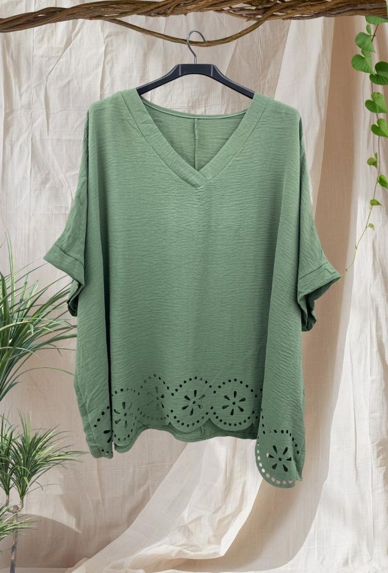 Blusa fluida con escote en pico y detalle calado en el bajo que aporta un toque femenino y diferente. Ligera, cómoda y con caída que no marca.