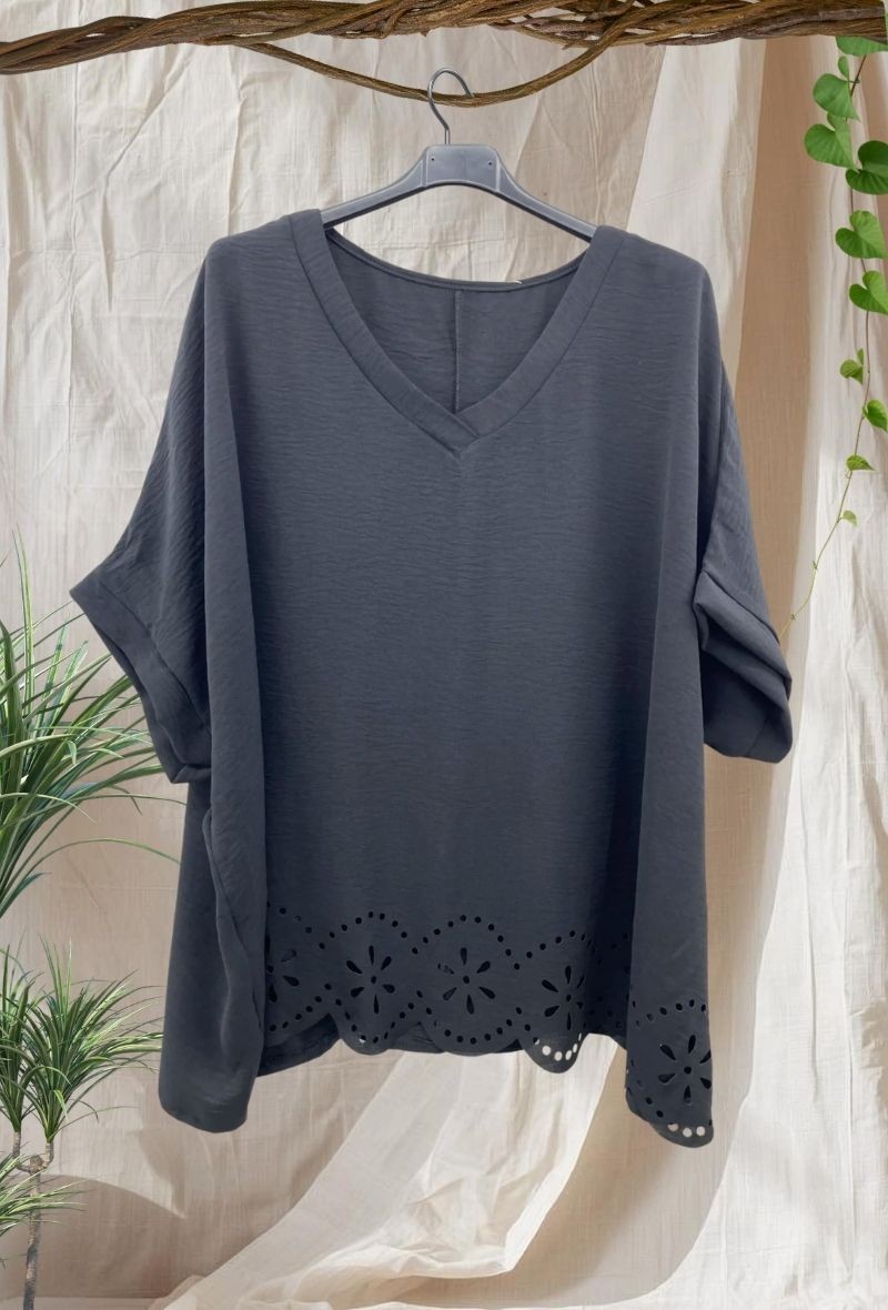 Blusa fluida con escote en pico y detalle calado en el bajo que aporta un toque femenino y diferente. Ligera, cómoda y con caída que no marca.