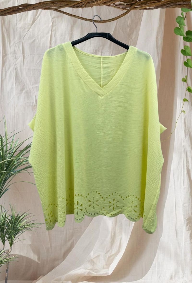 Blusa fluida con escote en pico y detalle calado en el bajo que aporta un toque femenino y diferente. Ligera, cómoda y con caída que no marca.