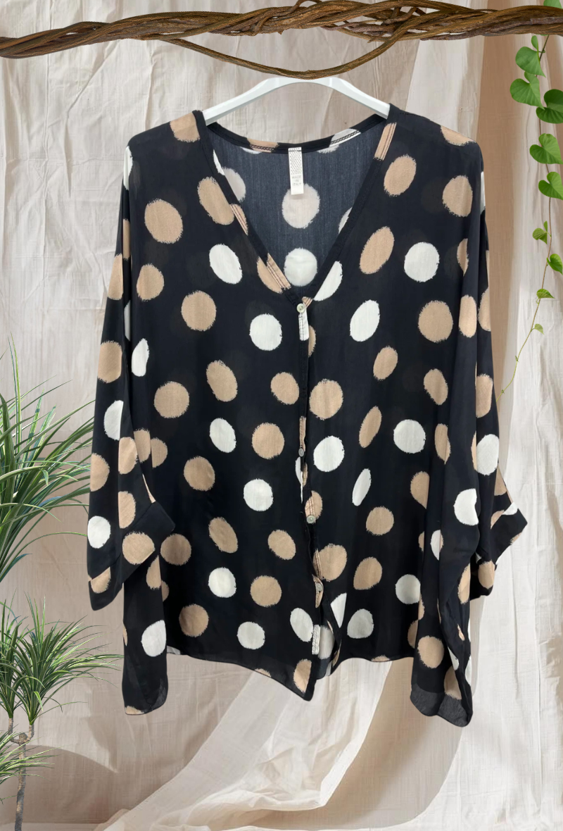 Blusa asedada con estampado en tonos vibrantes y caída fluida. Tejido ligero y suave que aporta un toque elegante sin renunciar a la comodidad. Corte amplio que favorece y estiliza.