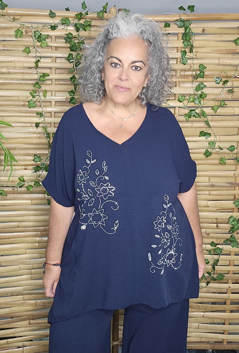 Blusa fluida con escote en pico y detalle de brillos en la parte delantera que aporta un toque especial. Cómoda, ligera y con caída que no marca.
