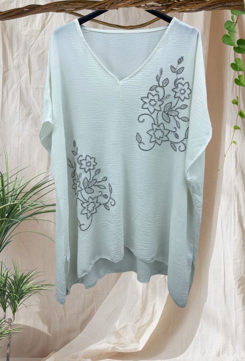 Blusa fluida con escote en pico y detalle de brillos en la parte delantera que aporta un toque especial. Cómoda, ligera y con caída que no marca.
