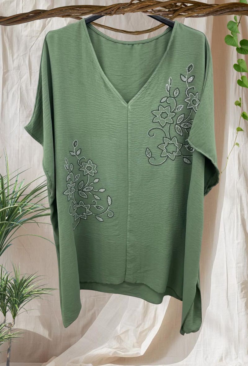 Blusa fluida con escote en pico y detalle de brillos en la parte delantera que aporta un toque especial. Cómoda, ligera y con caída que no marca.