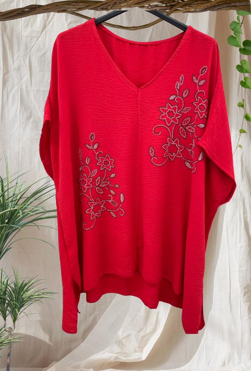 Blusa fluida con escote en pico y detalle de brillos en la parte delantera que aporta un toque especial. Cómoda, ligera y con caída que no marca.