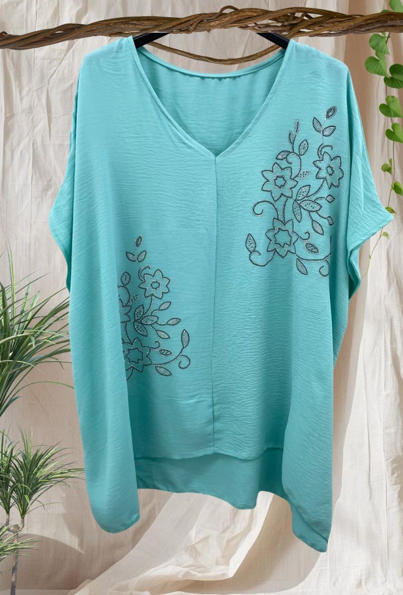 Blusa fluida con escote en pico y detalle de brillos en la parte delantera que aporta un toque especial. Cómoda, ligera y con caída que no marca.