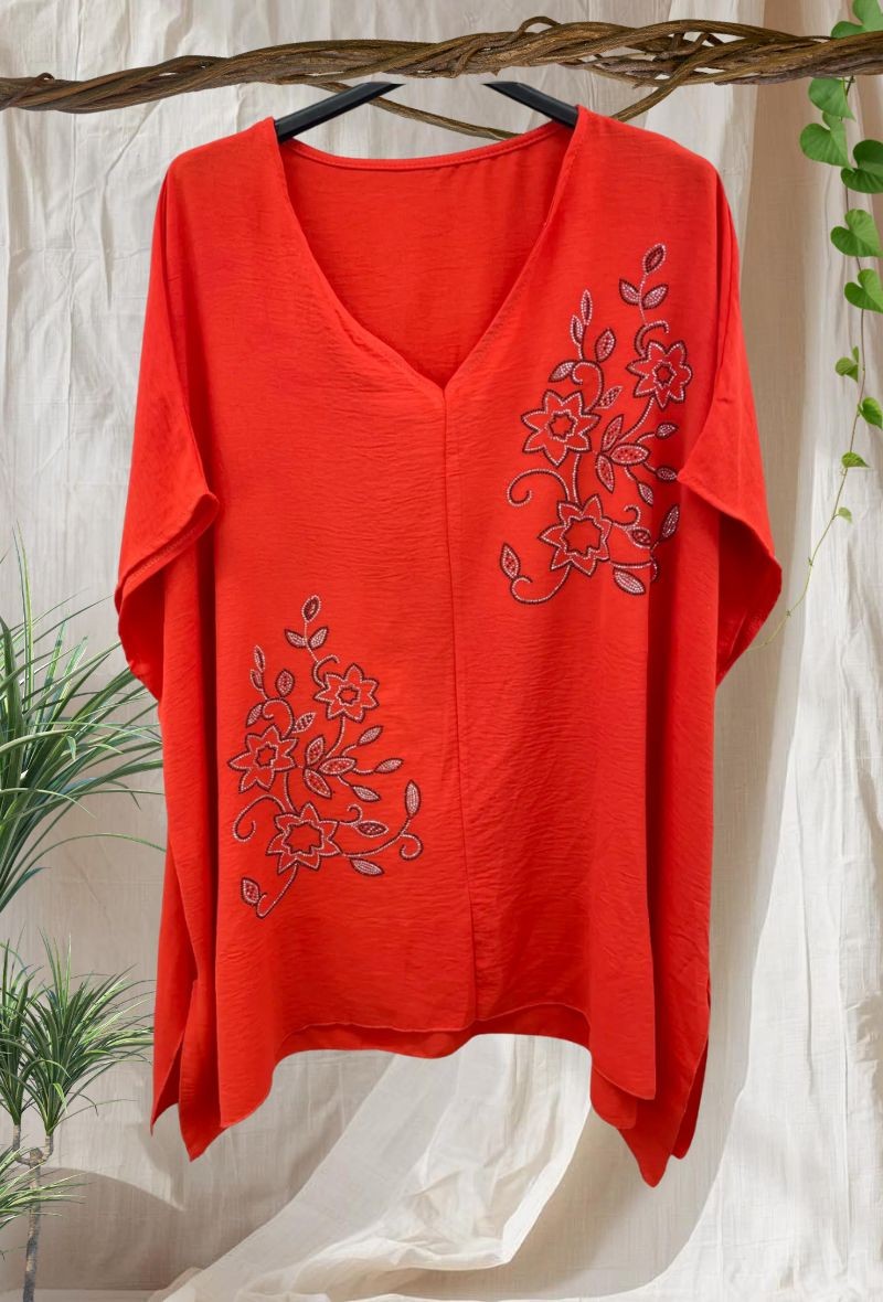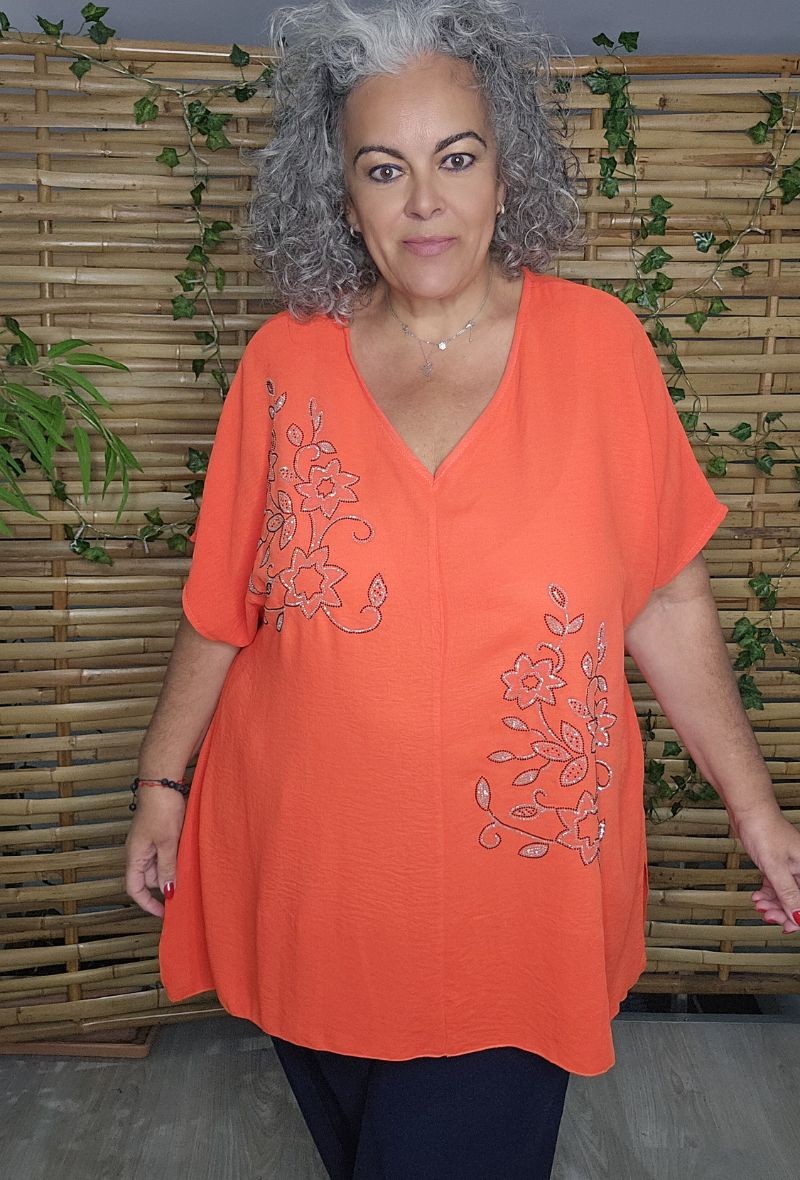 Blusa fluida con escote en pico y detalle de brillos en la parte delantera que aporta un toque especial. Cómoda, ligera y con caída que no marca.