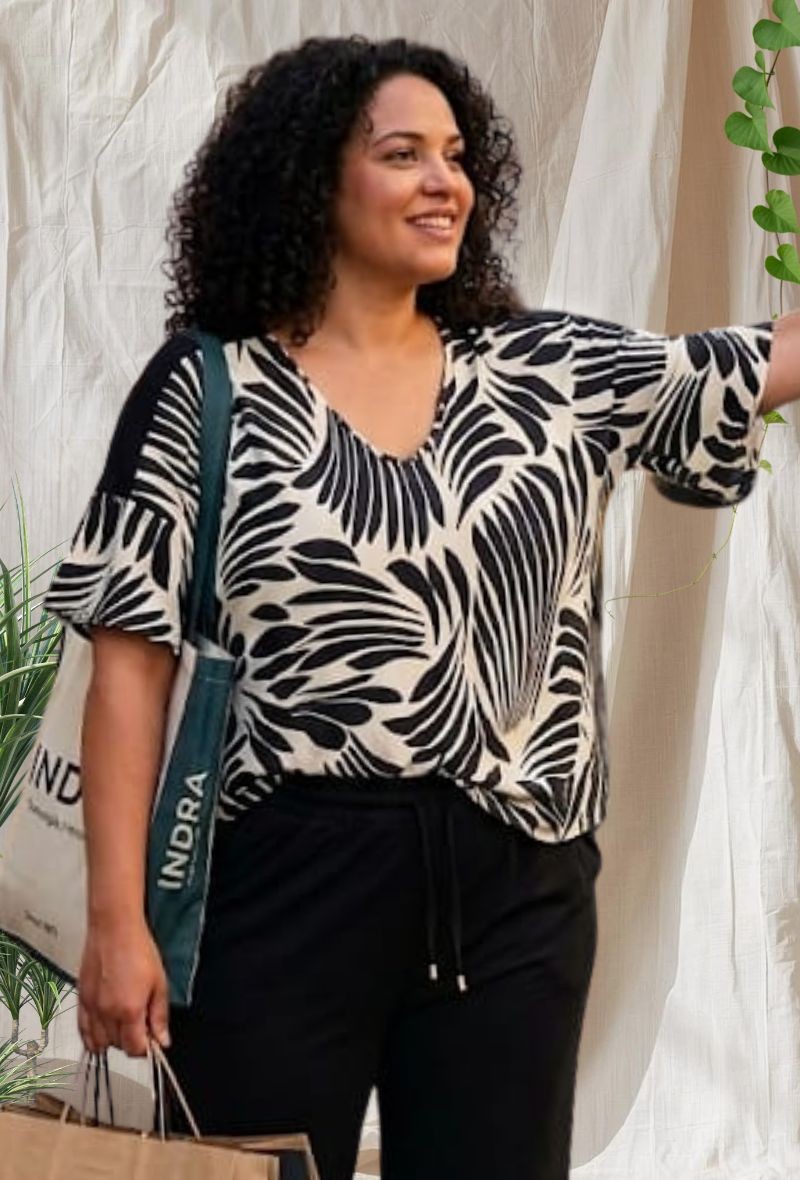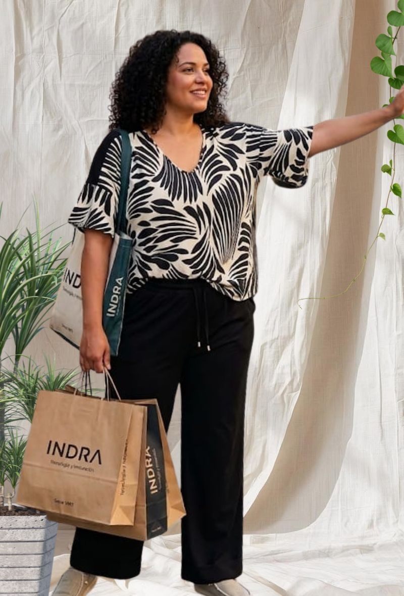 Blusa de bambula ligera de la colección Indra, con estampado elegante y caída fluida. Tejido fresco y cómodo, con corte suelto que estiliza y aporta movimiento.