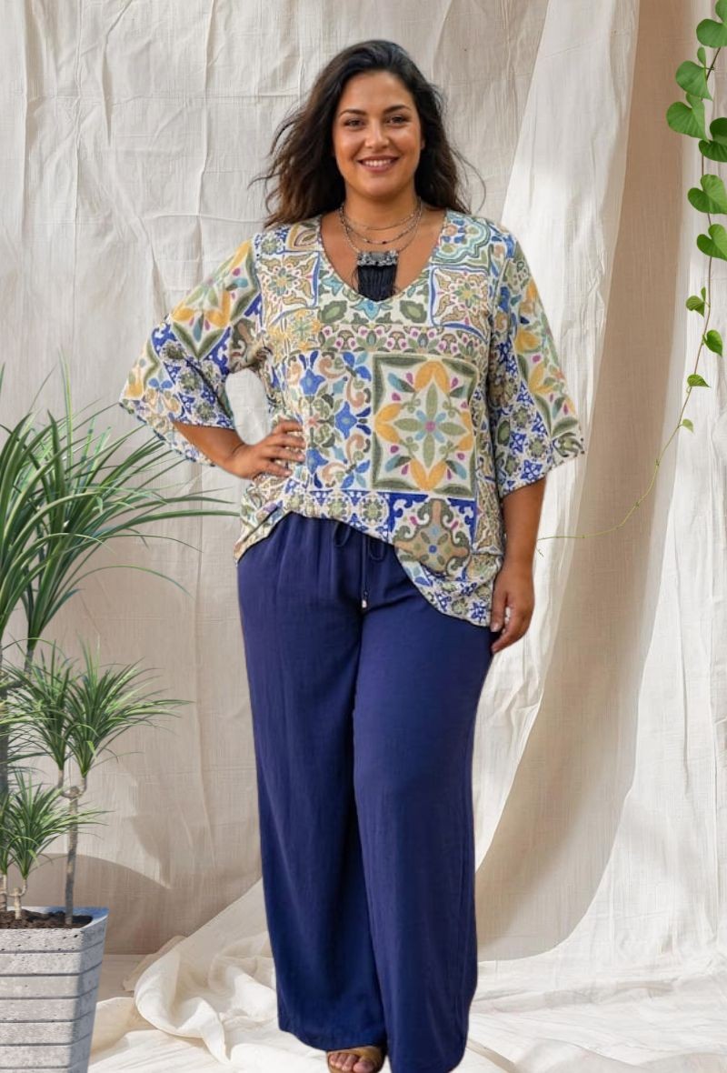 Blusa de bambula ligera de la colección Indra, con estampado elegante y caída fluida. Tejido fresco y cómodo, con corte suelto que estiliza y aporta movimiento.