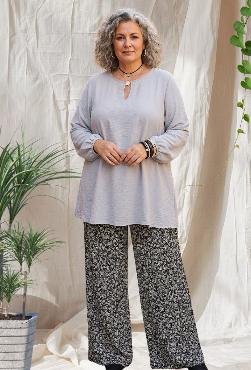Túnica larga y fluida en crepé de viscosa suave, con escote de lágrima y botón joya
