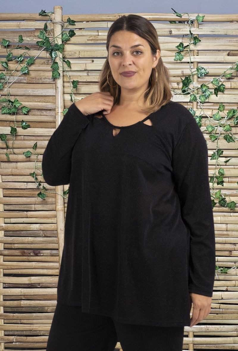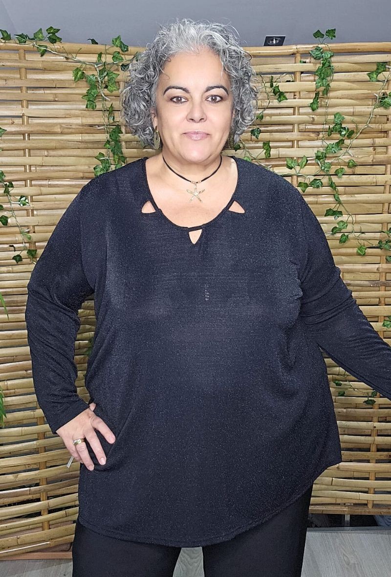 Túnica de punto con brillo en plata y en negro, con cuello escotado calado en triángulos.