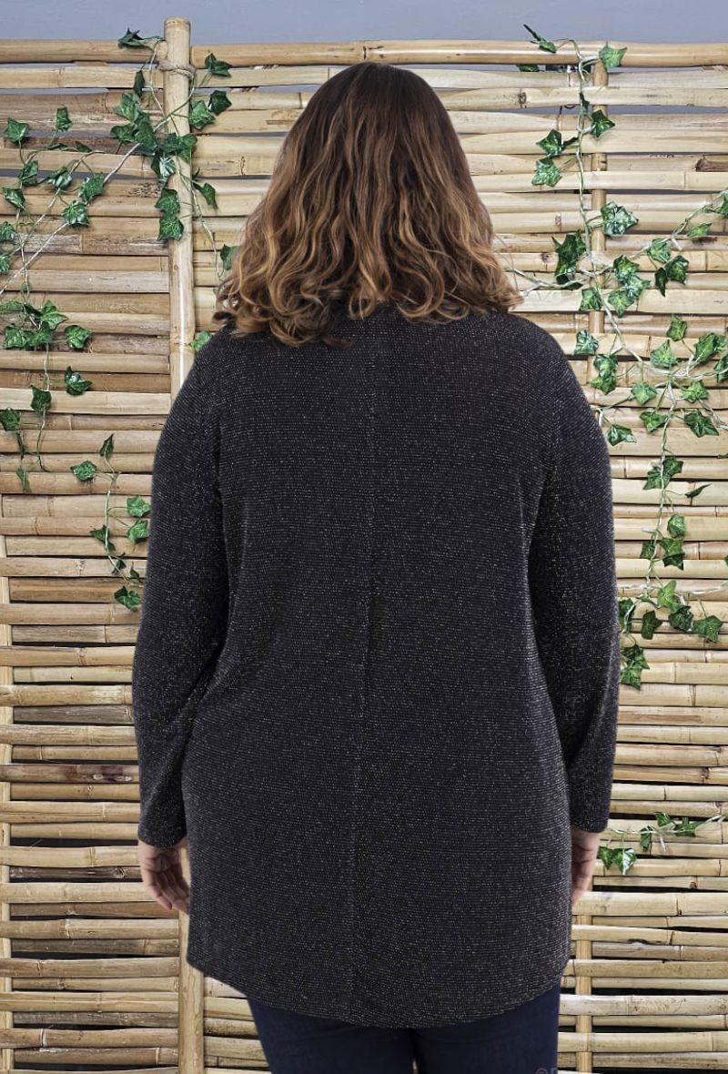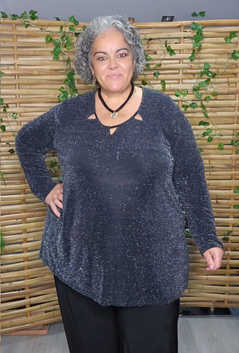 Túnica de punto con brillo en plata y en negro, con cuello escotado calado en triángulos.