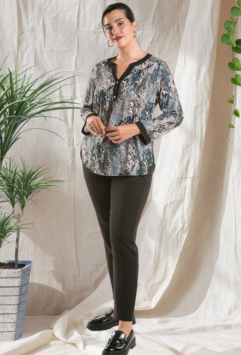Blusa estampada con cuello mao liso y tapeta, puños con botones decorativos y un diseño elegante y favorecedor. Ideal para crear looks cómodos y con estilo.