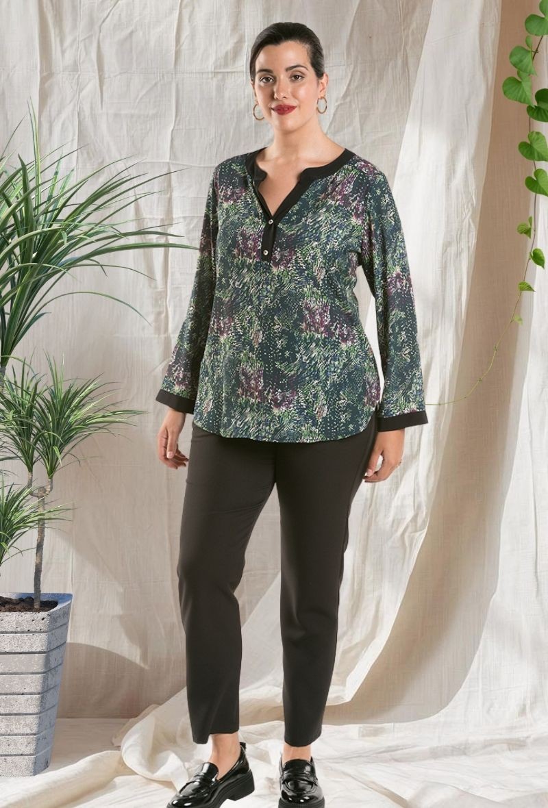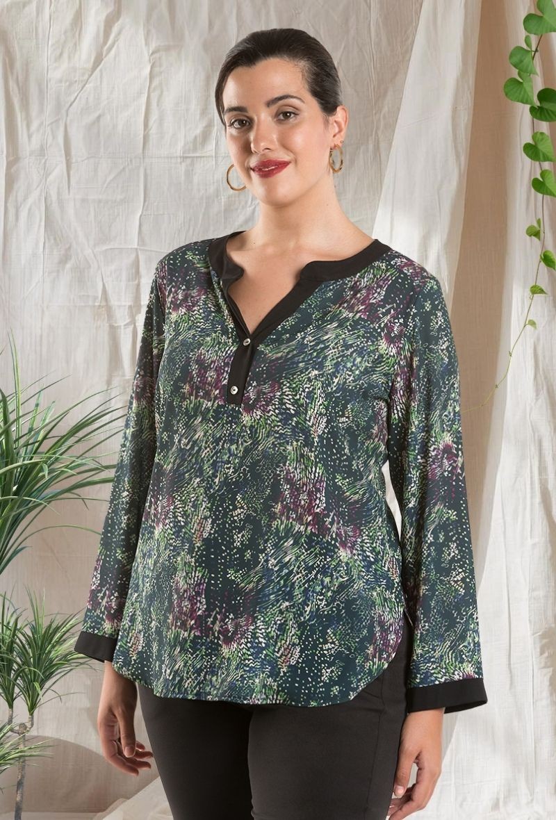 Blusa estampada con cuello mao liso y tapeta, puños con botones decorativos y un diseño elegante y favorecedor. Ideal para crear looks cómodos y con estilo.