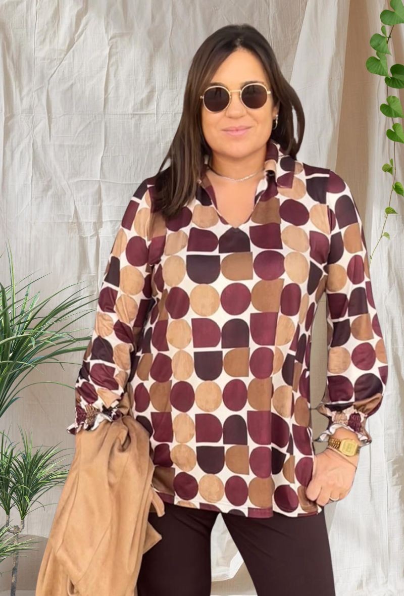 Camiseta de punto en poliéster con cuello en pico estilo polo y puños abullonados con canalé. Un diseño cómodo, moderno y femenino para el día a día.