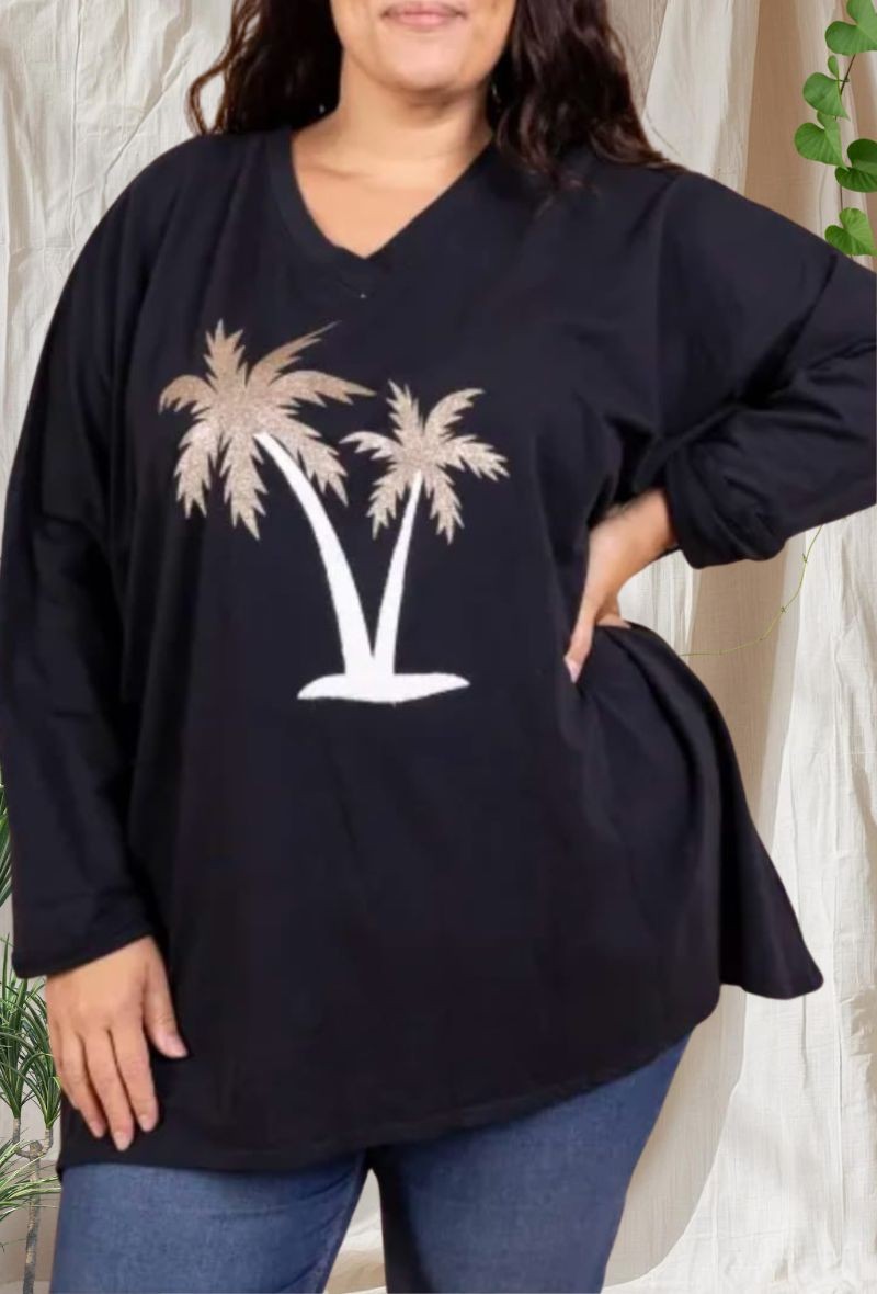 Camiseta tipo sudadera de algodón oversize, con cuello en V y estampado de palmeras doradas. Corte rectangular con mangas caídas, cómoda y actual.