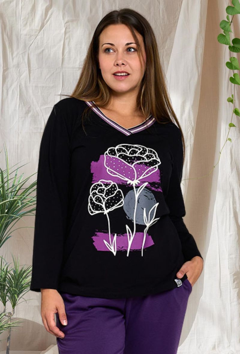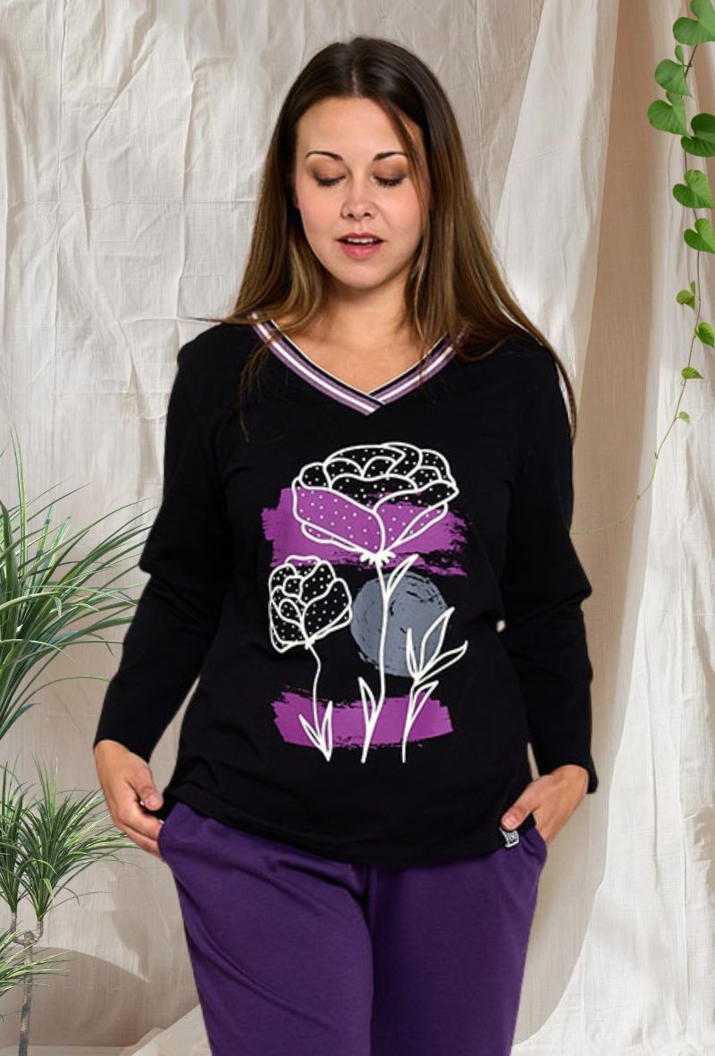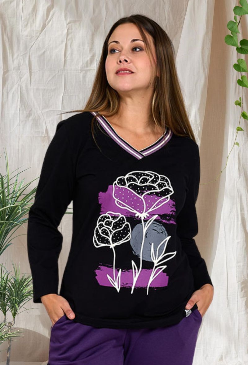 Camiseta de algodón elástico con manga larga, cuello en V de tricot y estampado frontal floral. Suave, cómoda y perfecta para un look casual con un toque femenino.