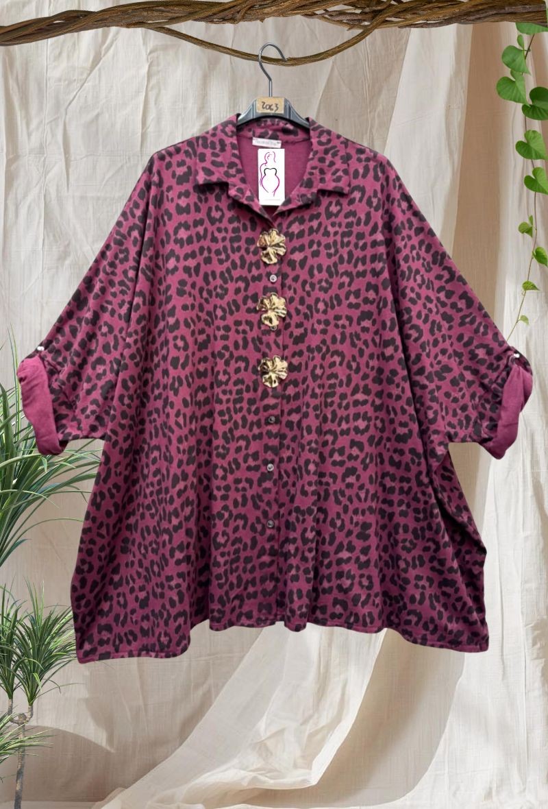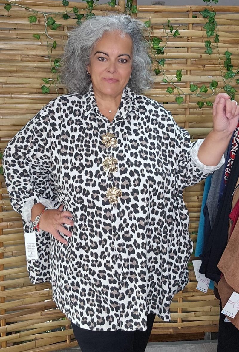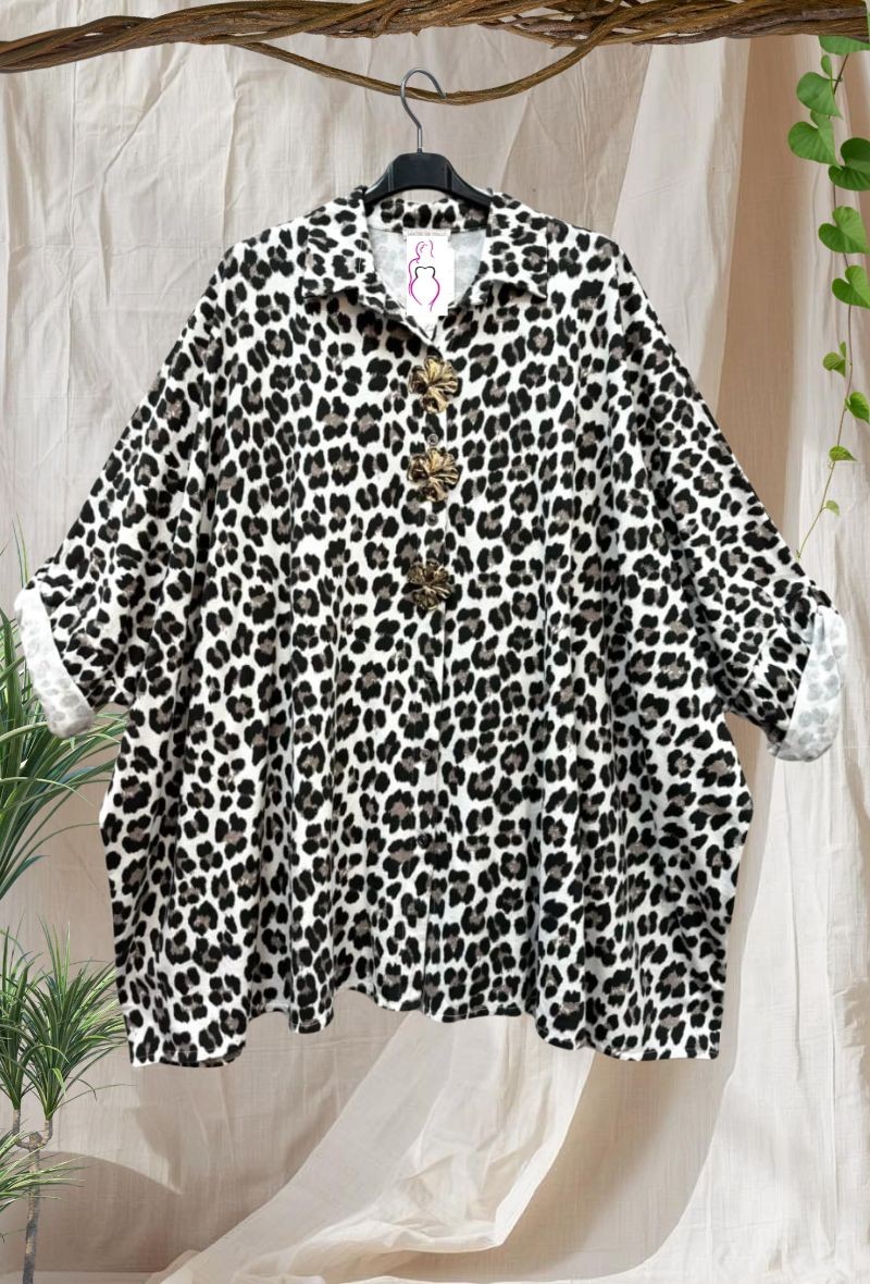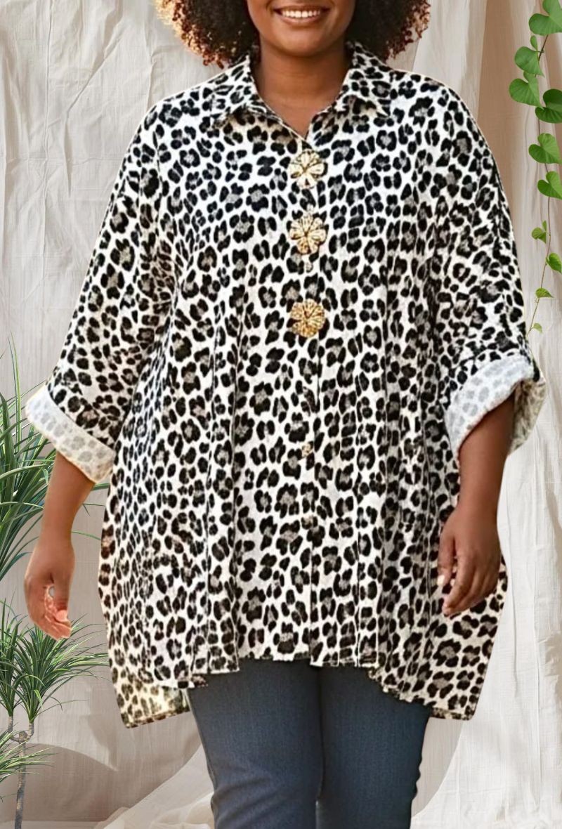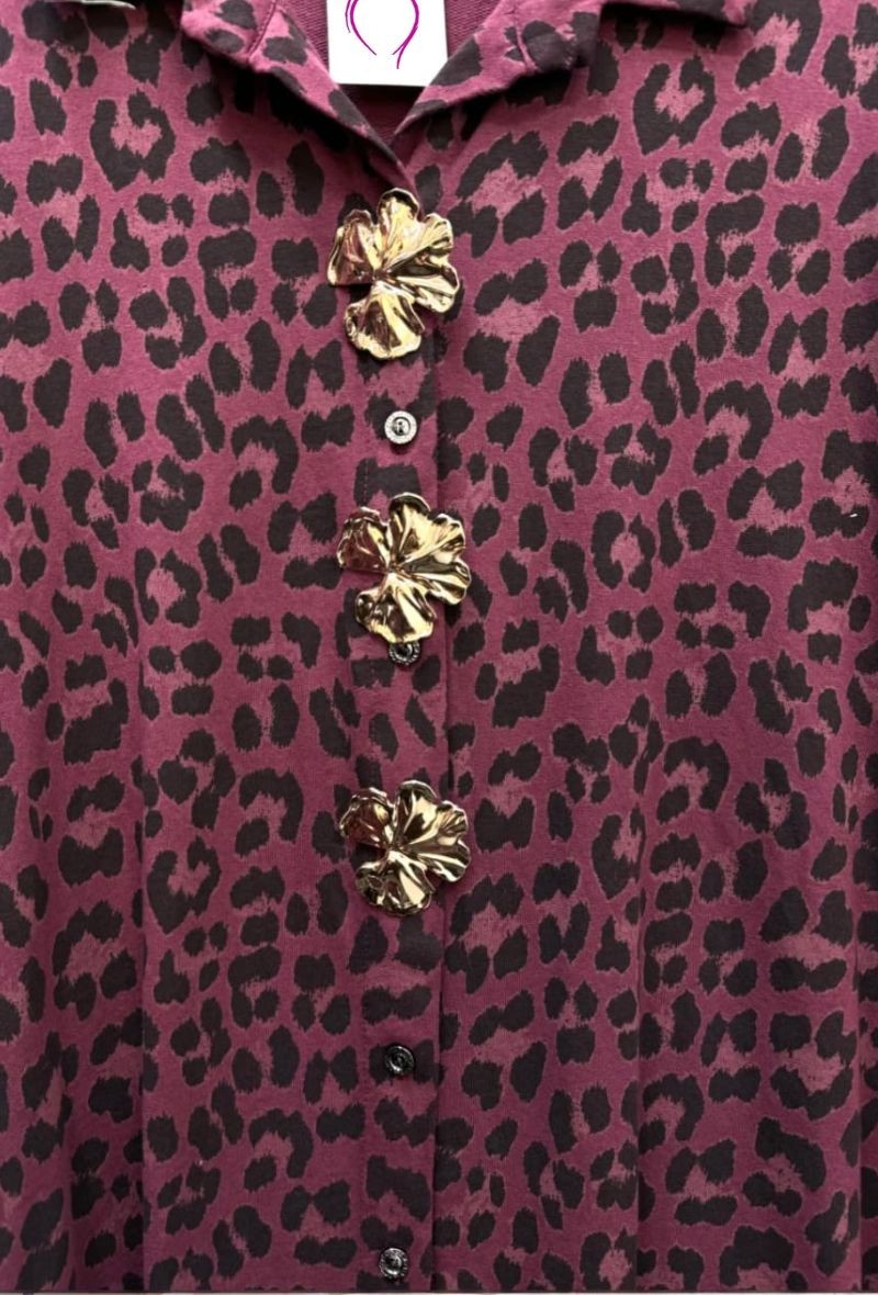 Camisa tipo sudadera de algodón transpirable, con botones y tres broches dorados extraíbles. Corte rectangular y mangas enrollables para un estilo cómodo y actual.