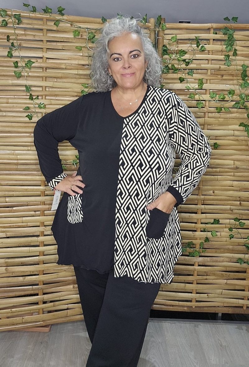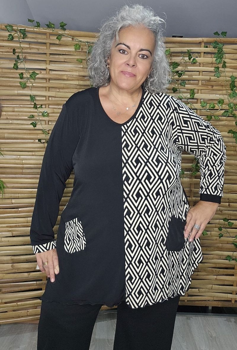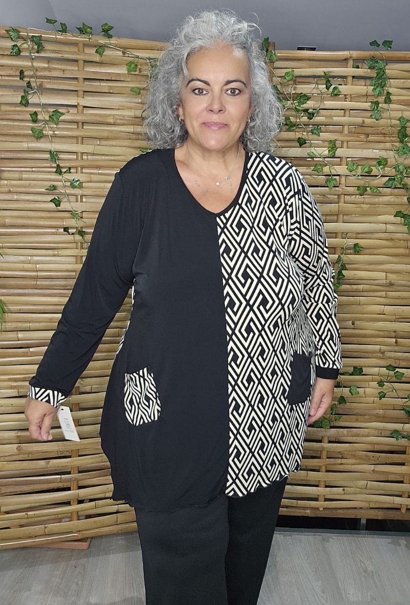 Camiseta asimétrica que combina tejido liso y estampado, con cortes irregulares en la parte inferior. Moderna, cómoda y con un estilo original que favorece la silueta.