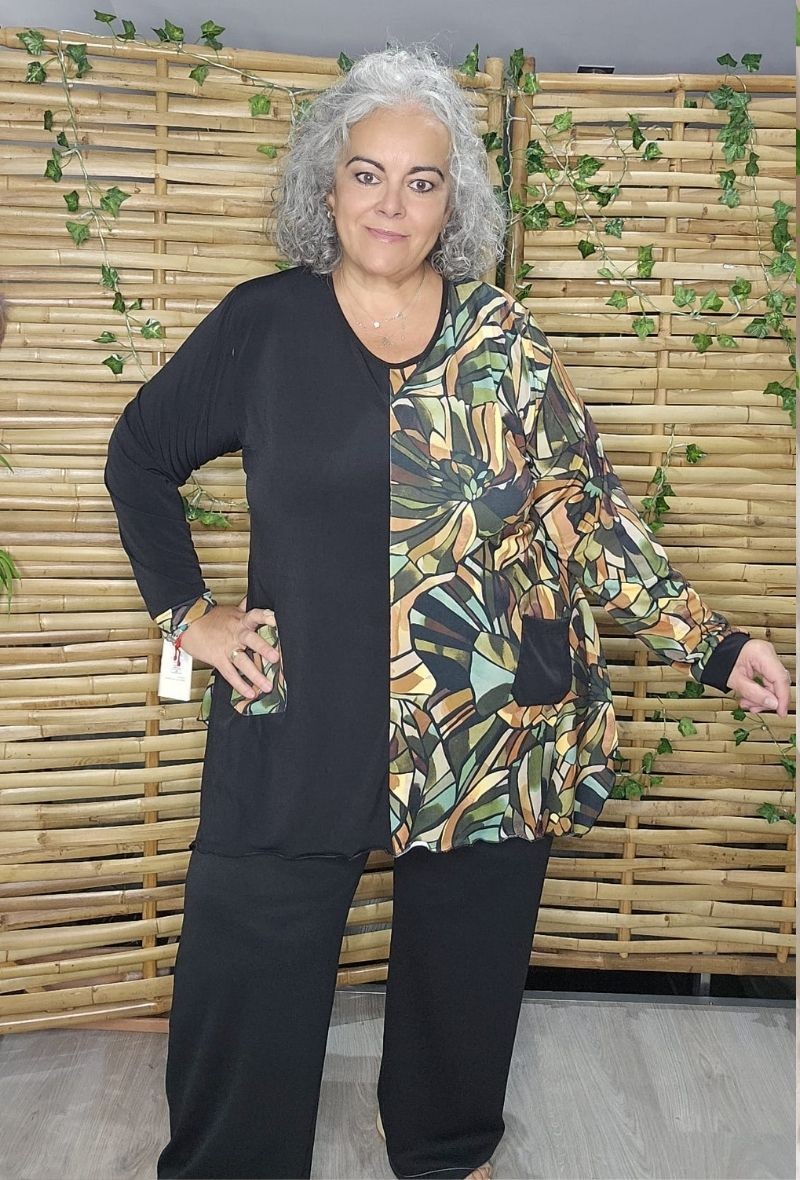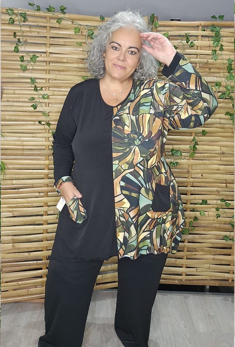 Camiseta asimétrica que combina tejido liso y estampado, con cortes irregulares en la parte inferior. Moderna, cómoda y con un estilo original que favorece la silueta.