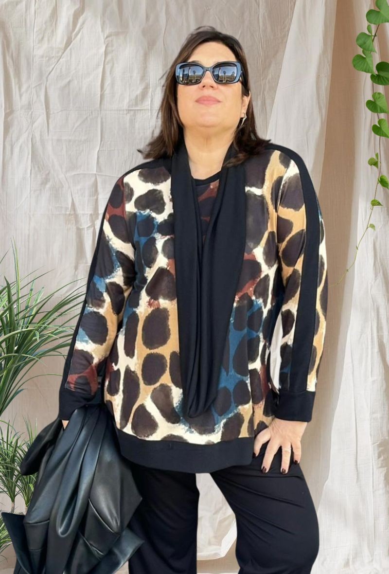 Casaca de punto estampada con cuello redondo y manga larga, acompañada de bufanda perfectamente combinada. Cómoda, moderna y favorecedora.