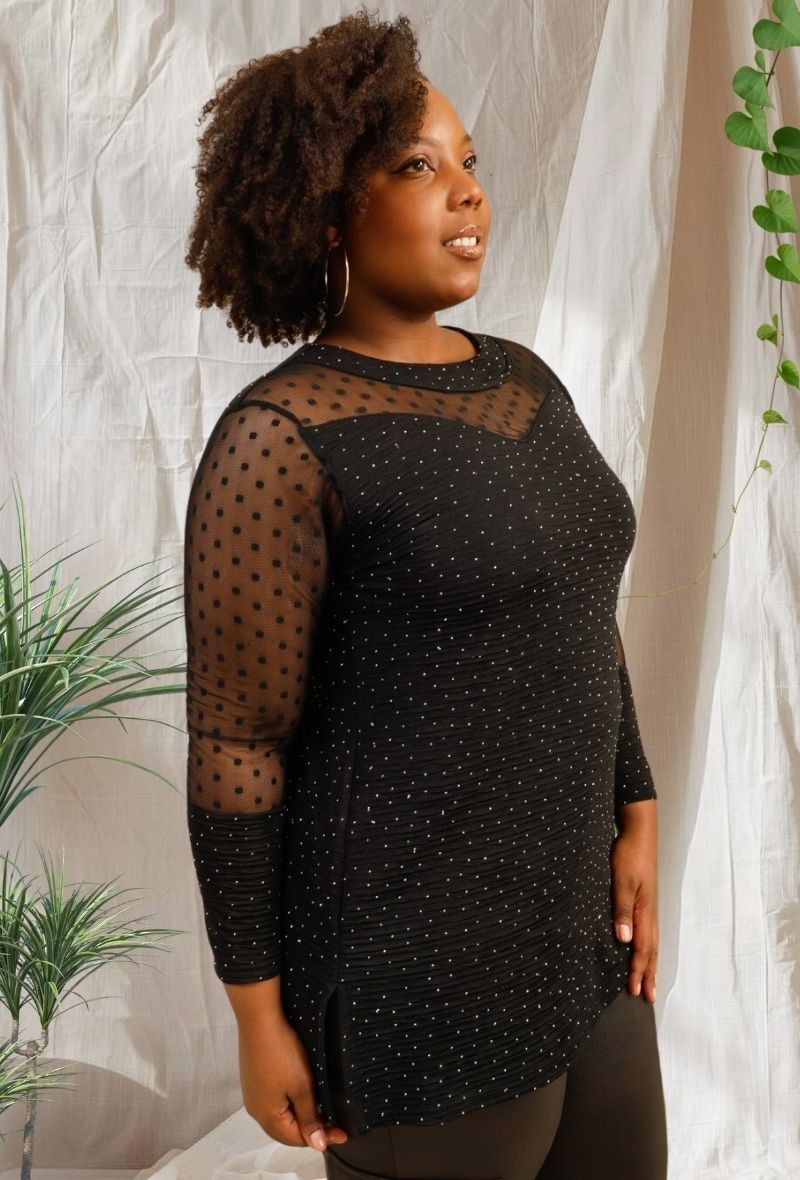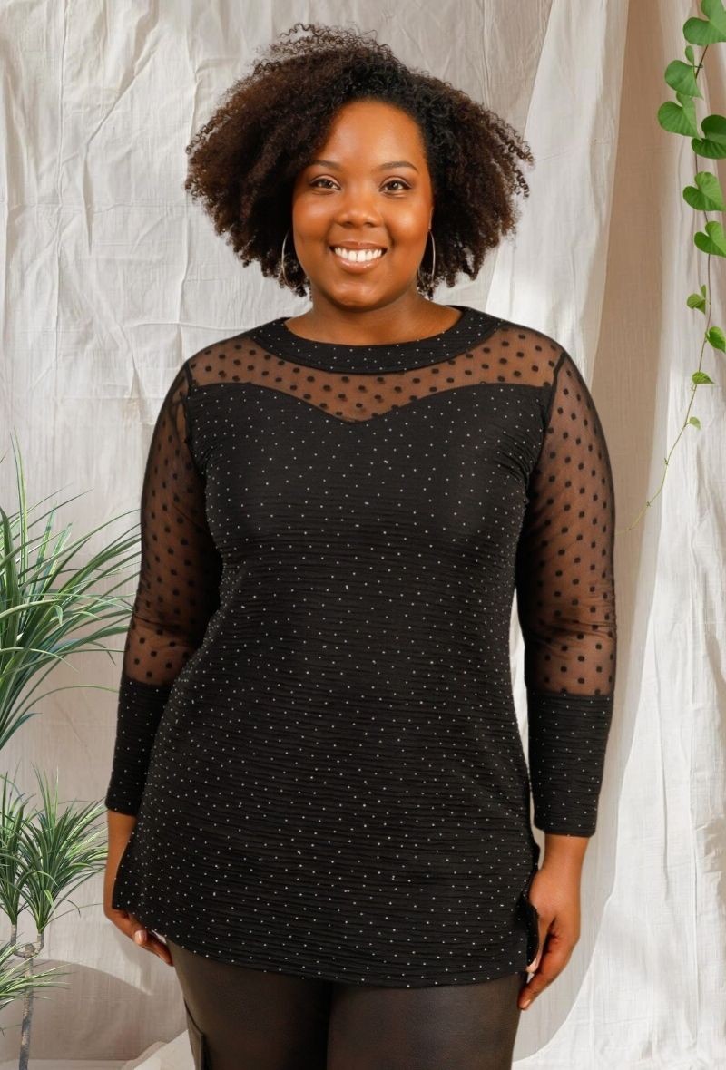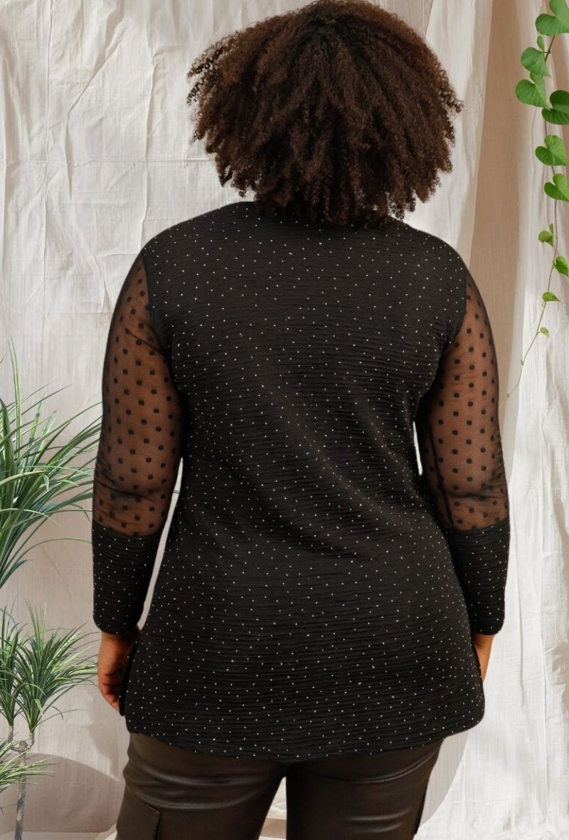 Túnica ligera y elegante de tul con detalles de strass, mangas largas y escote redondo. Una prenda ideal para mujeres con curvas que buscan un look sofisticado y favorecedor.