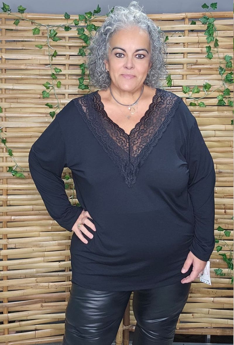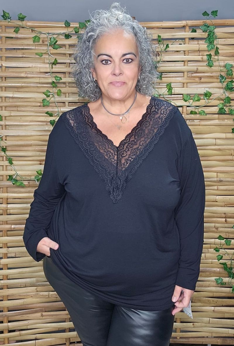 Camiseta básica estilo lencero, muy elástica y cómoda, con cuello pico delantero y trasero decorado con encaje ancho. Ideal como prenda base para looks casuales o más arreglados.