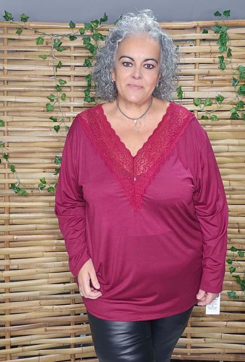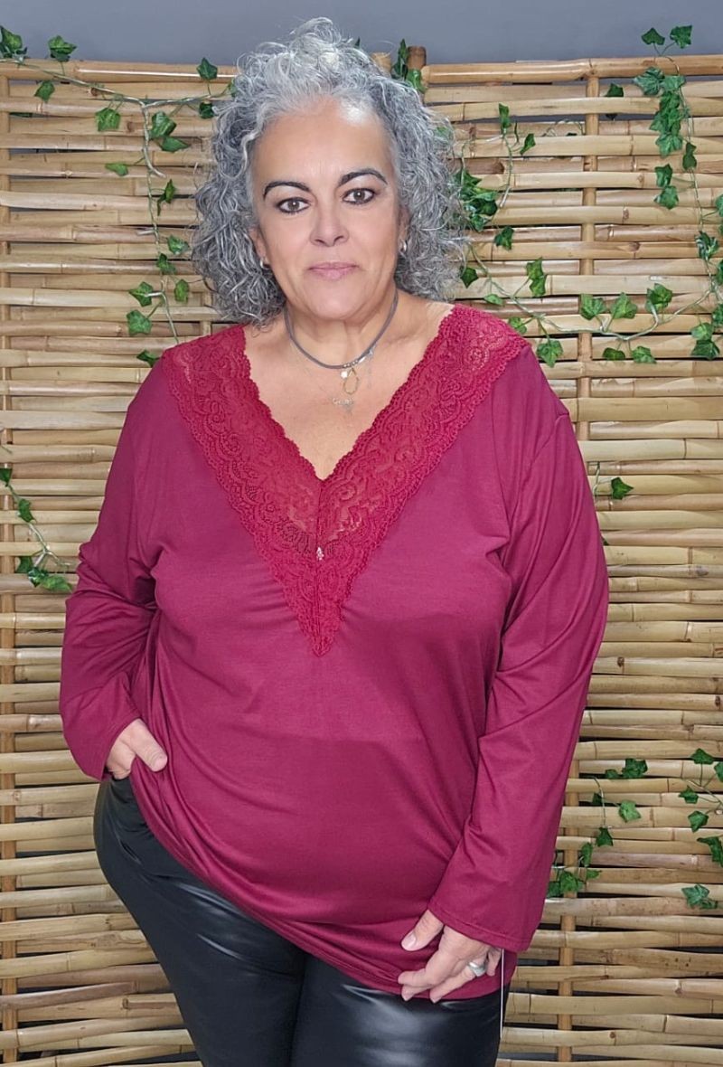 Camiseta básica estilo lencero, muy elástica y cómoda, con cuello pico delantero y trasero decorado con encaje ancho. Ideal como prenda base para looks casuales o más arreglados.