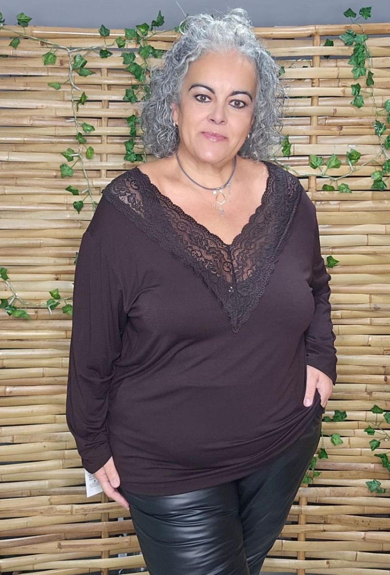 Camiseta básica estilo lencero, muy elástica y cómoda, con cuello pico delantero y trasero decorado con encaje ancho. Ideal como prenda base para looks casuales o más arreglados.