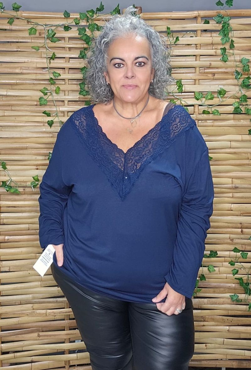 Camiseta básica estilo lencero, muy elástica y cómoda, con cuello pico delantero y trasero decorado con encaje ancho. Ideal como prenda base para looks casuales o más arreglados.