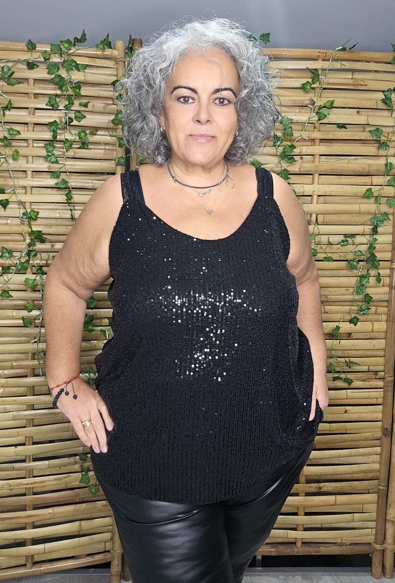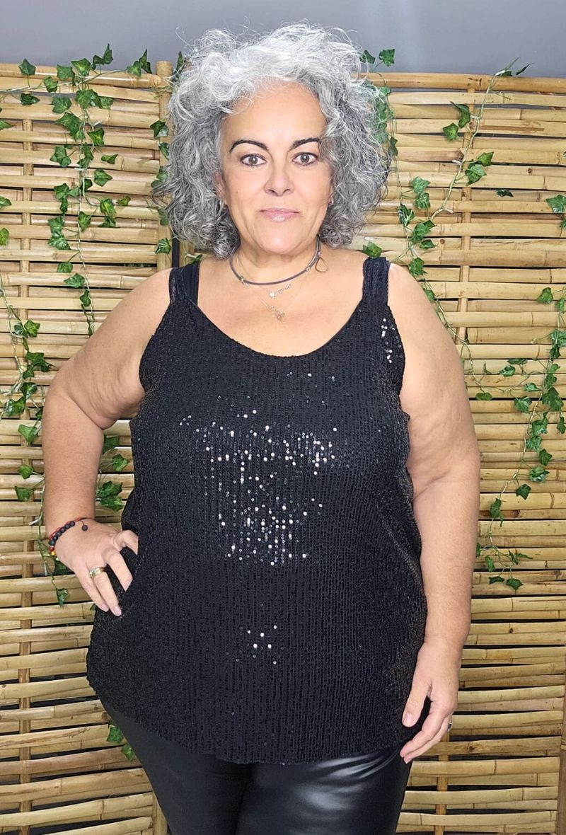 Top lencero con lentejuelas, tirantes finos y espalda con elástico para mayor comodidad. Da mucha talla y se adapta bien al cuerpo; a más talla, más corto queda. Ideal para looks de fiesta o para dar un toque brillante a tus outfits.