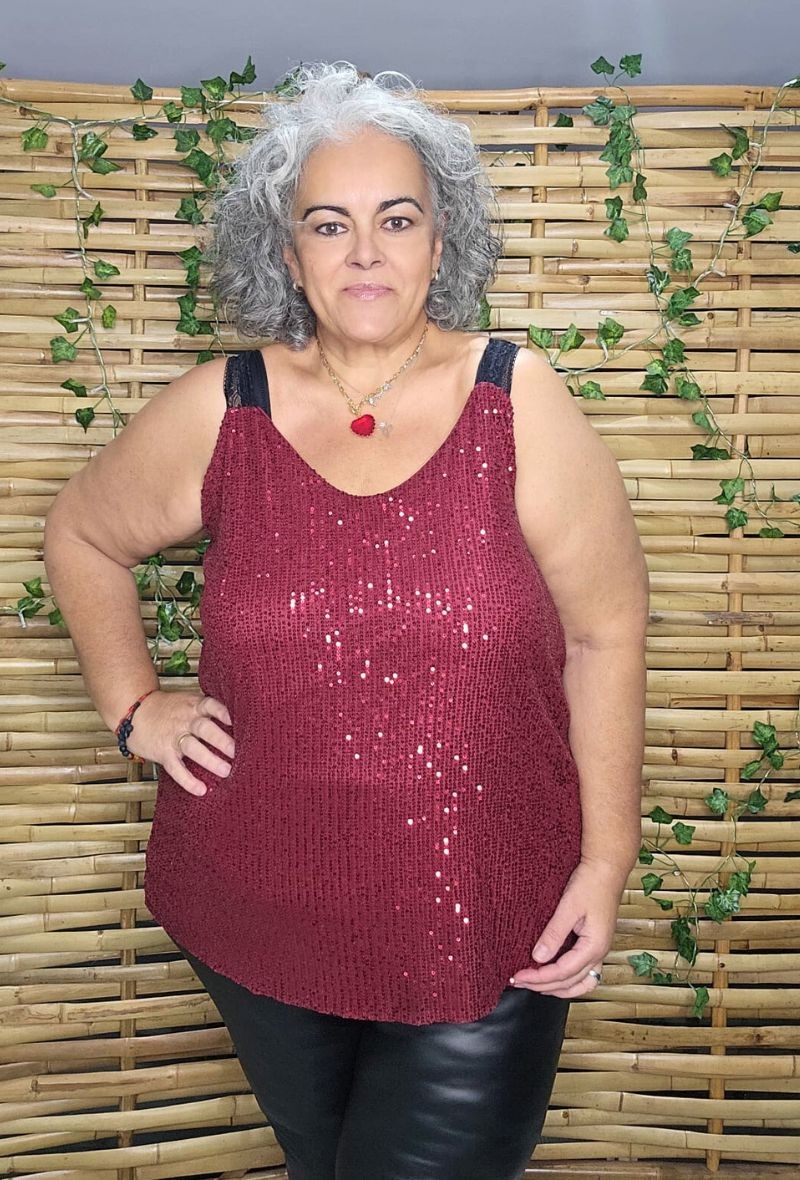 Top lencero con lentejuelas, tirantes finos y espalda con elástico para mayor comodidad. Da mucha talla y se adapta bien al cuerpo; a más talla, más corto queda. Ideal para looks de fiesta o para dar un toque brillante a tus outfits.