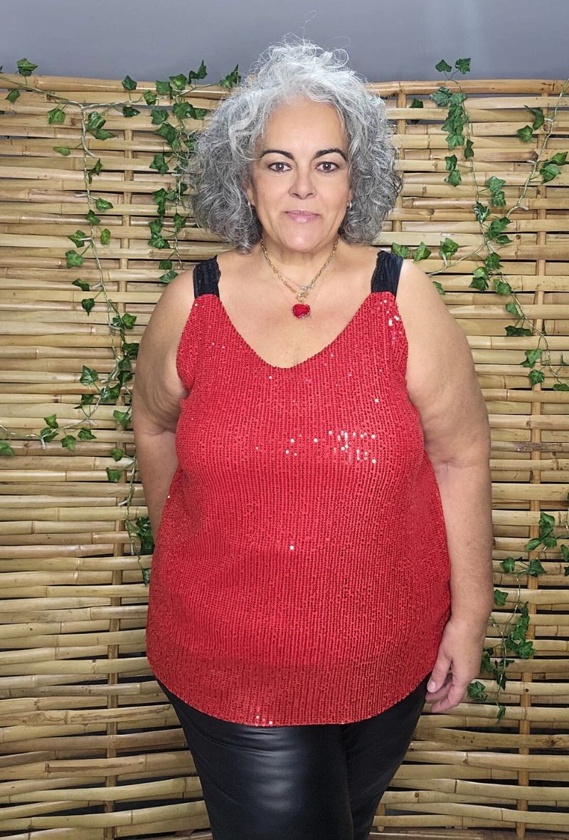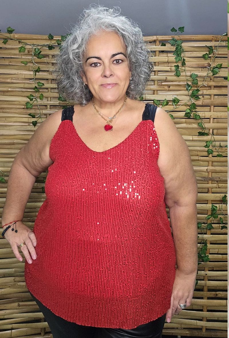 Top lencero con lentejuelas, tirantes finos y espalda con elástico para mayor comodidad. Da mucha talla y se adapta bien al cuerpo; a más talla, más corto queda. Ideal para looks de fiesta o para dar un toque brillante a tus outfits.